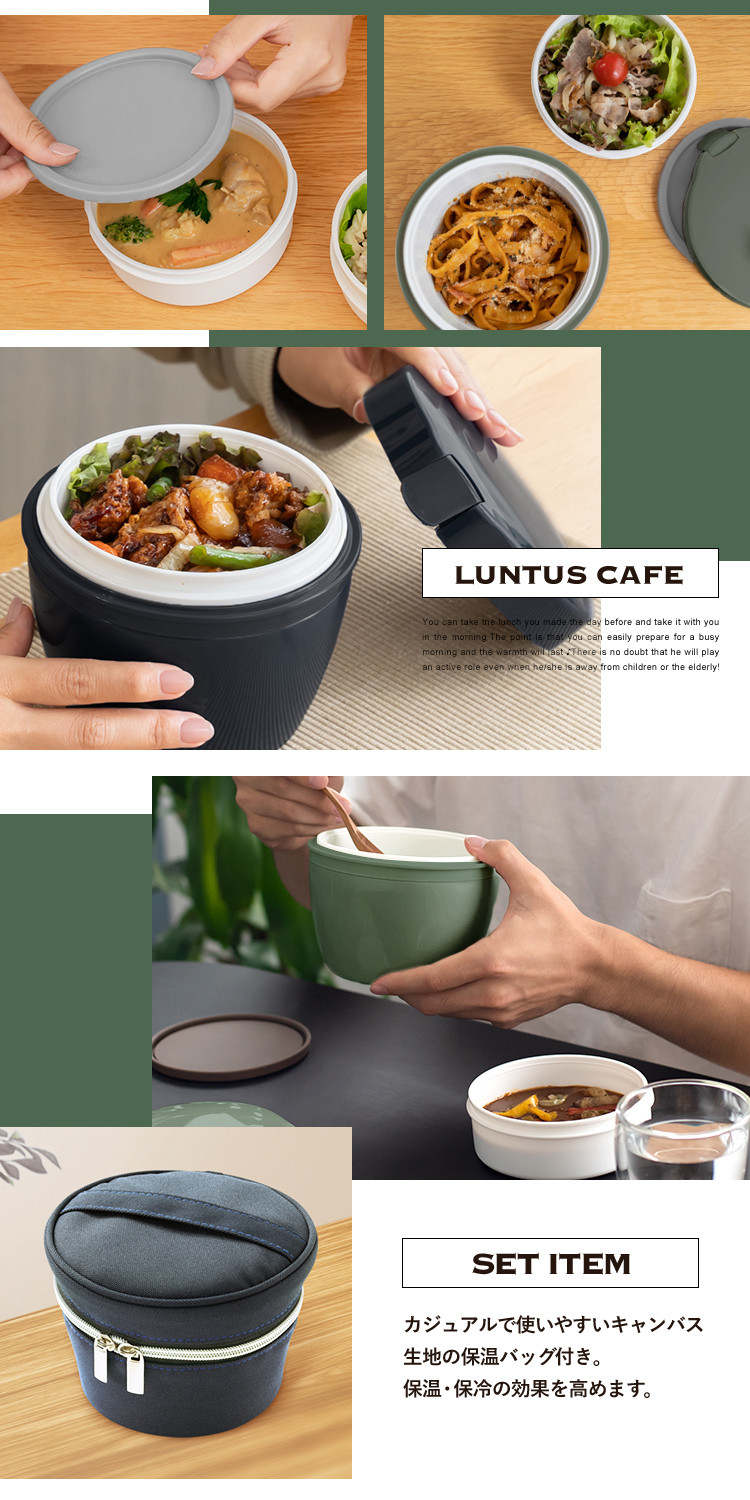 いつでもどこでも温かご飯が美味しく食べられるカフェ丼ランチ。ステンレス真空断熱構造で、保温・保冷で、中身の温度を保ちます。丼タイプなので、カレーや親子丼、パスタなど、お弁当のバリエーションが広がります。保冷もできるから、暑い夏にも冷製メニューにも。丼ぶり形状で、お子様でも食べやすく、おかずも詰めやすいので、お母さんお父さんも大助かり。食洗器にも対応、忙しい家事の短縮にも。レンジで、温め直しもできます。たっぷり食べられる大盛りサイズ800mlで、育ち盛りのお子さんに最適です。カフェ丼 CD800保温バッグ付き。