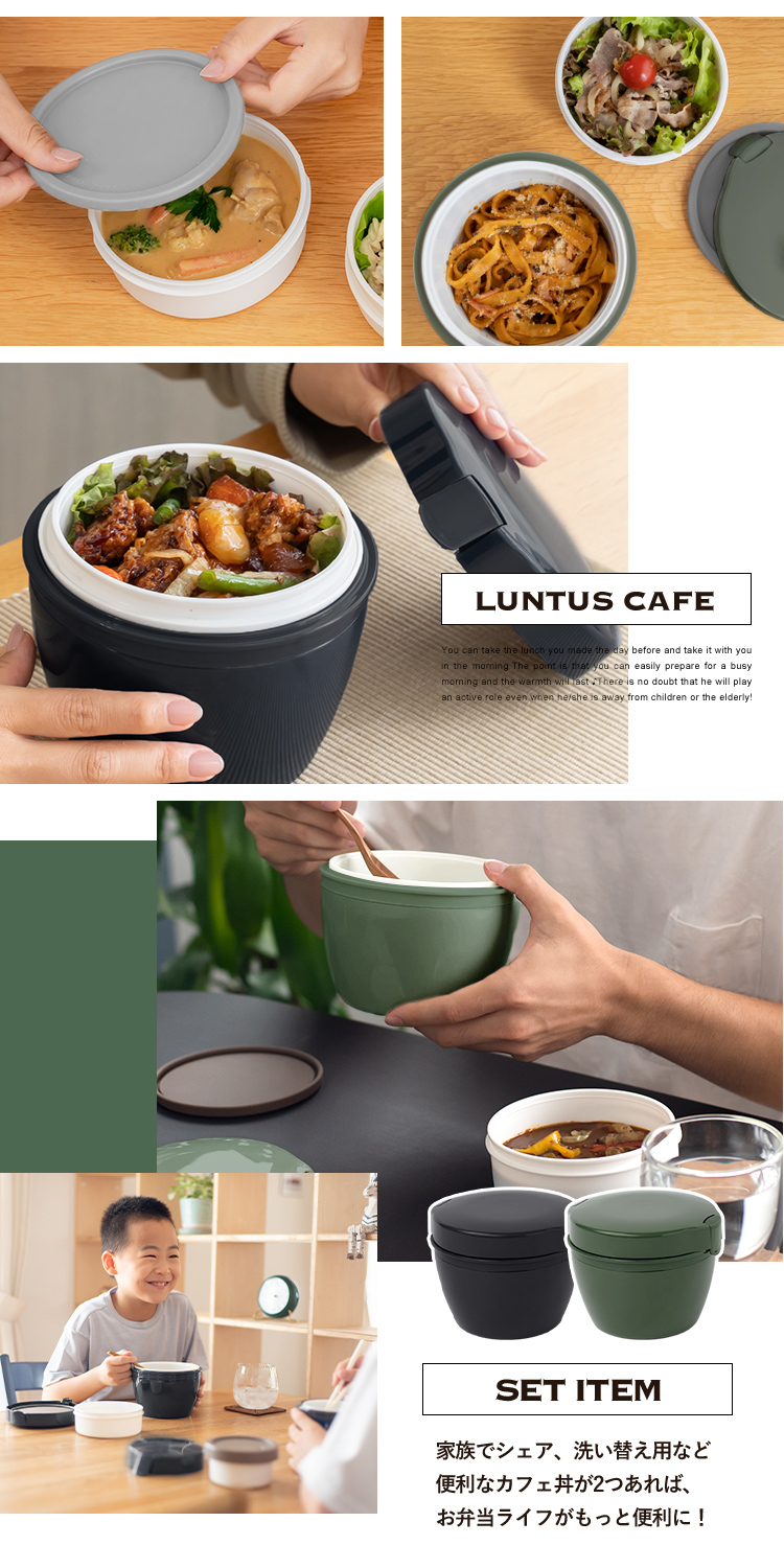 いつでもどこでも温かご飯が美味しく食べられるカフェ丼ランチ。ステンレス真空断熱構造で、保温・保冷で、中身の温度を保ちます。丼タイプなので、カレーや親子丼、パスタなど、お弁当のバリエーションが広がります。保冷もできるから、暑い夏にも冷製メニューにも。丼ぶり形状で、お子様でも食べやすく、おかずも詰めやすいので、お父さんお母さんも大助かり。食洗器にも対応、忙しい家事の短縮にも。レンジで、温め直しもできます。たっぷり食べられる大盛りサイズ800mlで、育ち盛りのお子さんに最適。カフェ丼 CD800 2個セットの販売ページ。