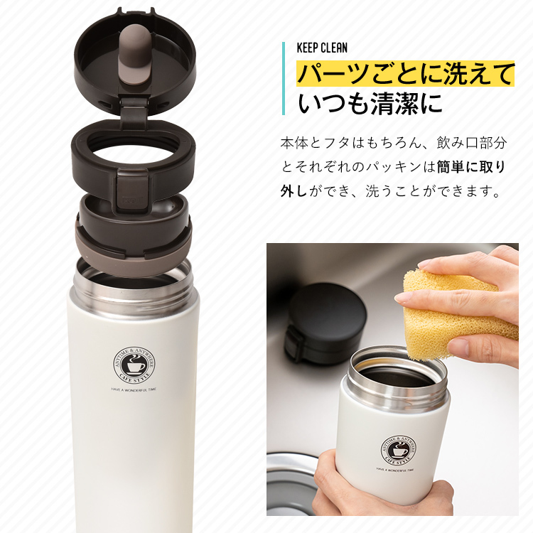 材質 : 本体=ステンレス鋼(アクリル樹脂塗装)、飲み口・フタ・フタ本体=ポリプロピレン、ロックレバー=ABS樹脂、ストッパー=ポリアセタール、バネ・軸=ステンレス鋼、フタパッキン・飲み口パッキン=シリコーンゴム