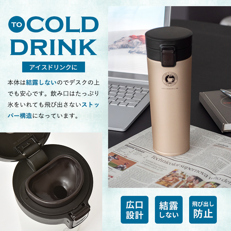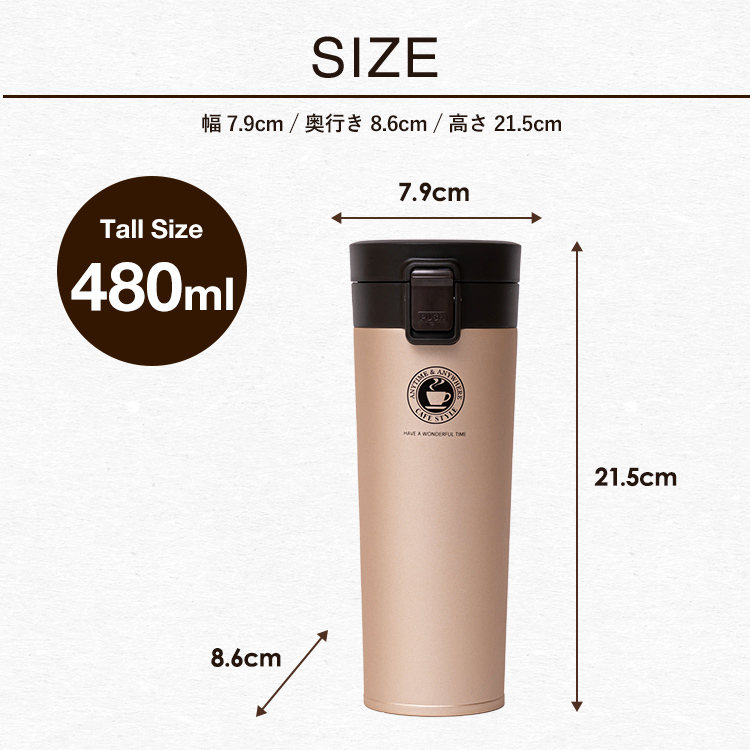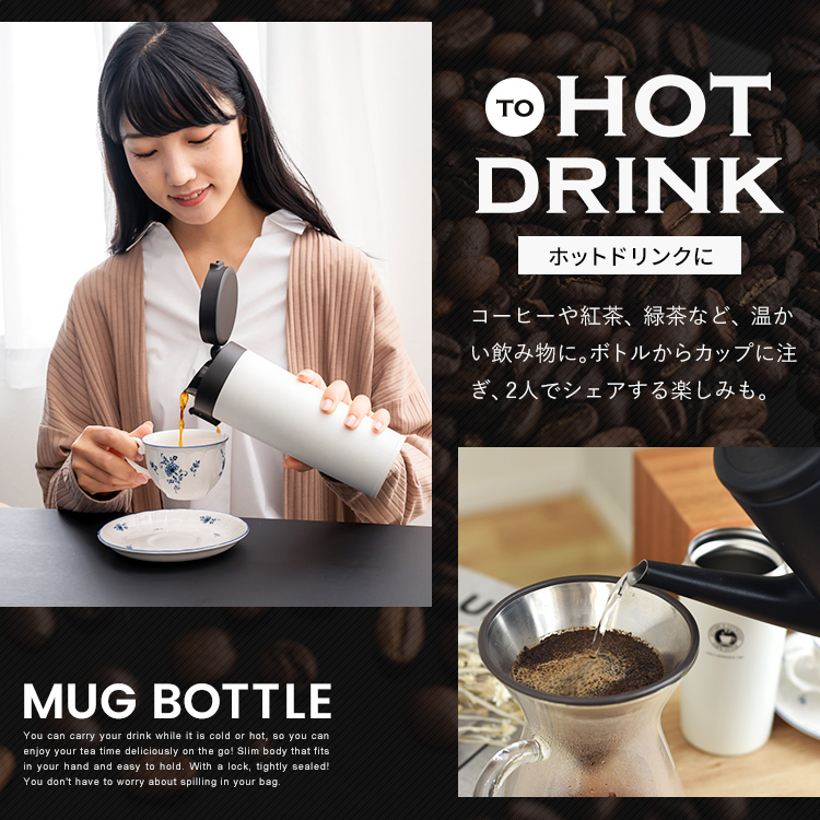 温かい珈琲や紅茶を、持ち運べる「保温マグボトル」。ステンレス真空断熱構造で、温かさが長持ち。ワンタッチオープンで、開閉も簡単、直飲みできます。自宅から持ち運べるから、節約にもピッタリ。他のボトルにはない、テーパー構造でスタイリッシュさを演出。たっぷり飲みたい方におススメ480mlサイズです。