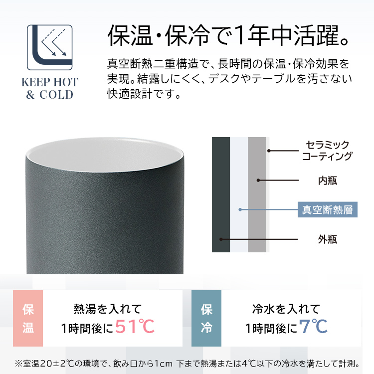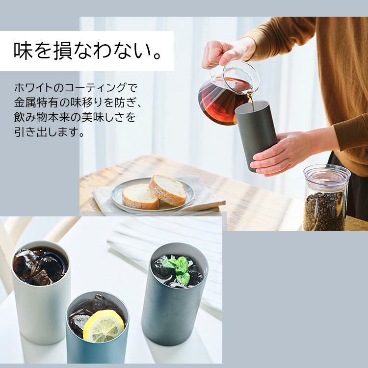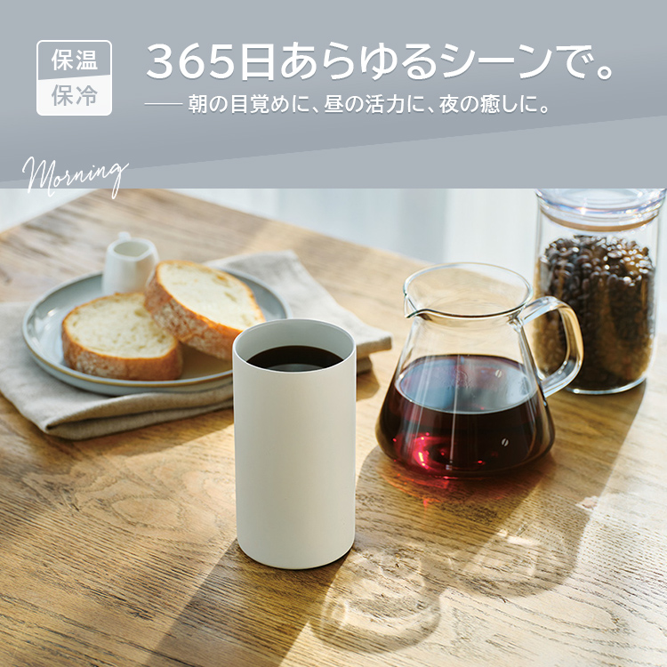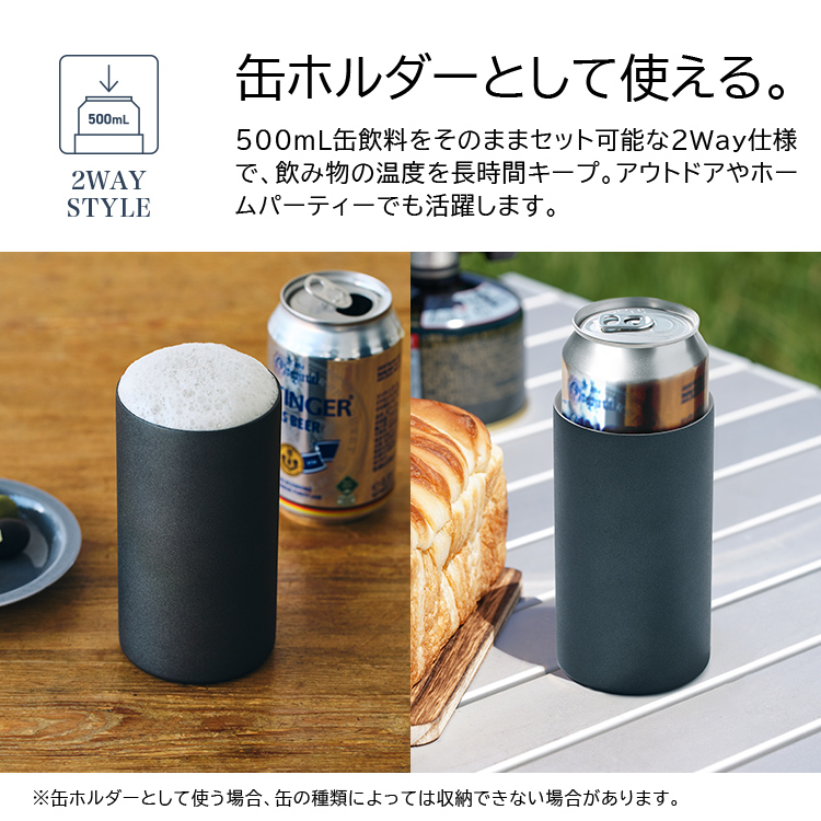 生活シーンを選ばず、使える真空断熱ステンレスタンブラーが登場。ビール・ハイボールなどお酒はもちろん。オフィスやランチにも最適なスタイル。保温保冷で温かさ、冷たさを長時間キープ。内面セラミック塗装で汚れがつきにくく、オール食洗機対応。丸氷が入るストレートタイプで500ml缶も入るので、缶ホルダーとしても使える2WAYアイテムです。