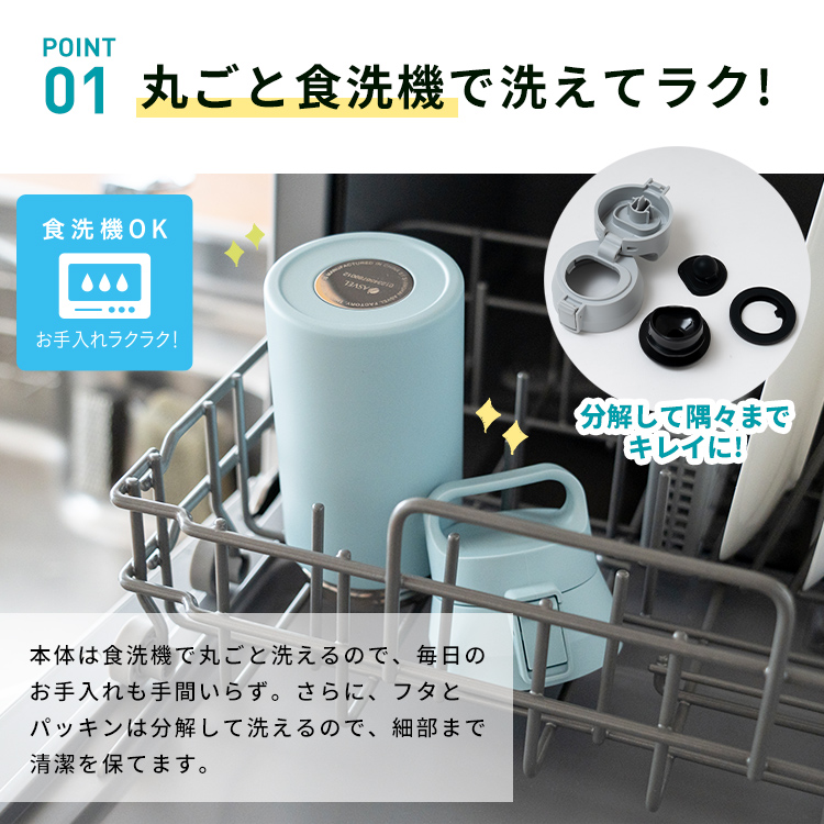 生活のあらゆるシーンで大活躍するハンドル付きのステンレスマグボトルです。持ち手付きで持ち運び開け閉めもカンタン。全てのパーツが食洗機対応でお手入れもカンタン。