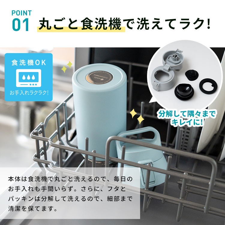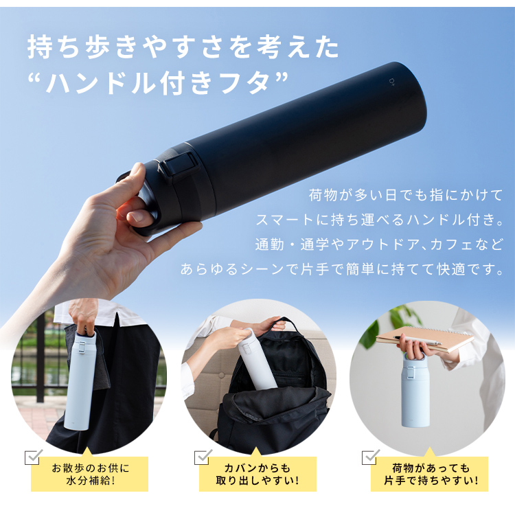 生活のあらゆるシーンで大活躍するハンドル付きのステンレスマグボトルです。持ち手付きで持ち運び開け閉めもカンタン。全てのパーツが食洗機対応でお手入れもカンタン。