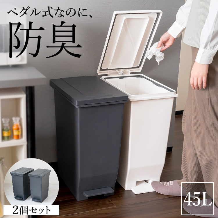 手を使わず、足で開閉できるペダルペール。臭いもれを防ぐパッキン付きで生ごみを捨てても安心。ホワイト・ブラックを組み合わせれば、分別にも最適。ゴミ袋をセットできる袋止め付き。たっぷり入る大容量サイズ(45リットル )のお得な2個セットです。