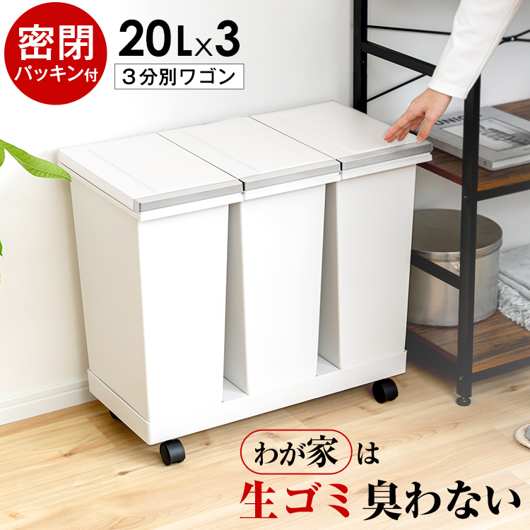 わが家は生ゴミ臭わない。密閉パッキン付きで臭いがもれない密閉プッシュペールシリーズに、おしゃれなモノトーンの「密閉プッシュ式資源ゴミ横型3分別ワゴン」。気になるキッチンの 生ごみのニオイ 分別 問題を解決。優れた密閉性で、赤ちゃんや介護のおむつ、犬猫用のペットシーツを捨てるのにも最適。片手で開閉できるワンプッシュオープン式のフタでゴミ捨てラクラク。20リットル のゴミ箱が3つ乗ったワゴンは、キャスター付で移動も楽。