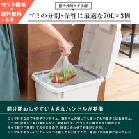 屋内屋外問わず活躍するゴミ箱 SPハンドル付ダストボックス 70リットル 。開け閉めしやすい大きなハンドルが特徴です。倒しても中身がこぼれないロック付きなので、犬猫対策、カラス対策や小さなお子様のいたずら対策に最適。袋止め付きで、市販の70リットル のゴミ袋が使えます。フタは開いた状態で固定できるので、ゴミ袋交換もラクラク。大容量なので、ベランダやお庭などでの収集日までの一時保管にも向いています。フタのカラーを組み合わせれば、ペットボトルや空き缶などの資源ごみの分別にも最適。シンプルデザインとおしゃれなカラーで、ファミリーからカフェなどの店舗・オフィスまで使える45リットル ・70リットル ・90リットル の4サイズ展開。(3個セットの販売ページです)