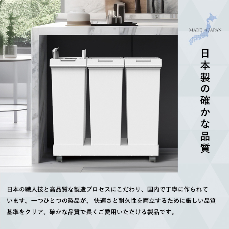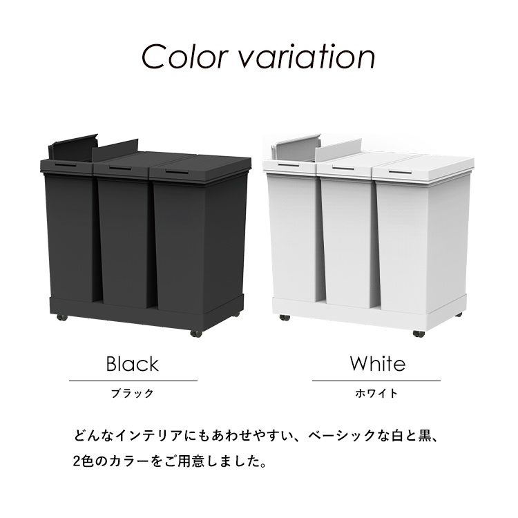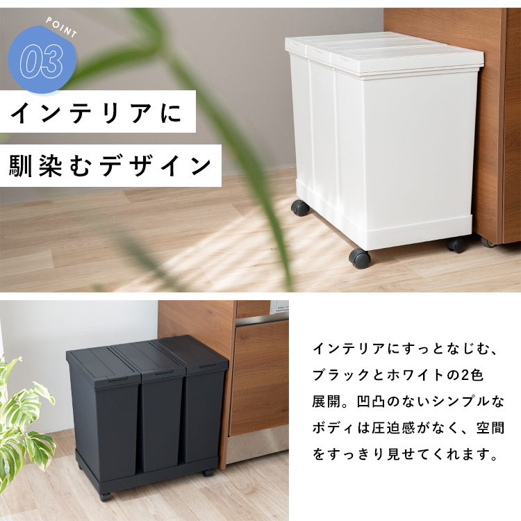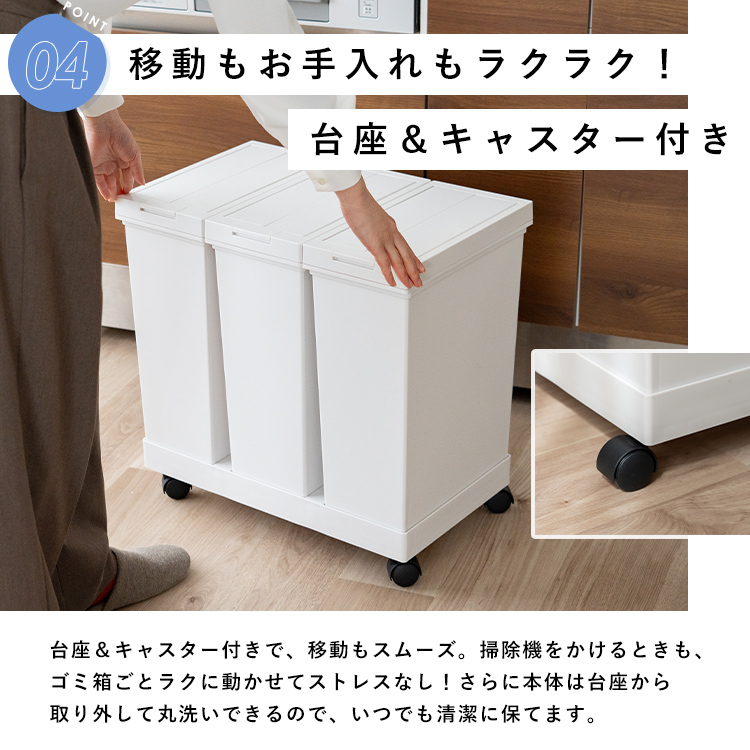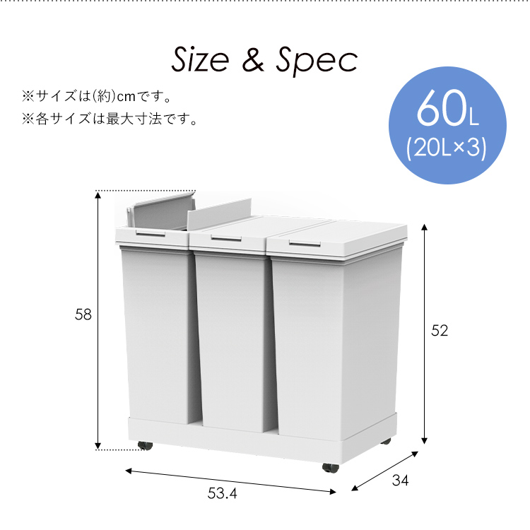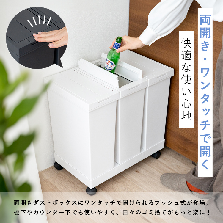 ワンタッチで開けられるプッシュ式。フタが両方向に開くので、キッチンカウンター下など収納スペースにぴったり収まります!キャスター付きで、お掃除の際の移動もラクラク。3分別で空き缶やペットボトルの分別にも最適。たっぷり入る大容量60リットル 。スタイリッシュでお洒落なキッチンを演出します。