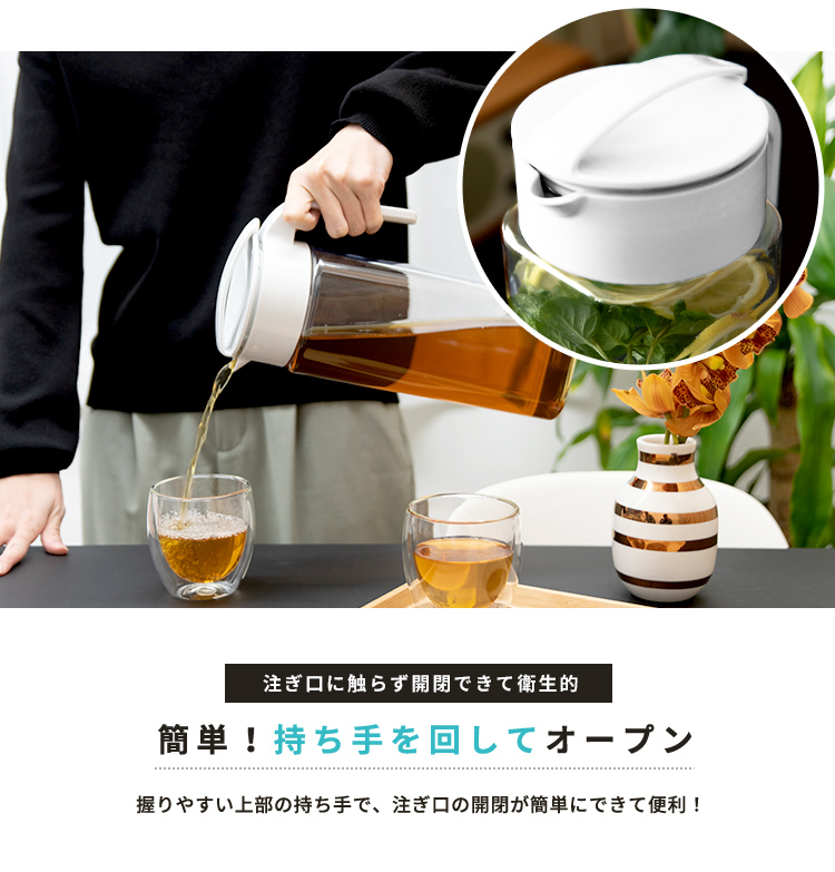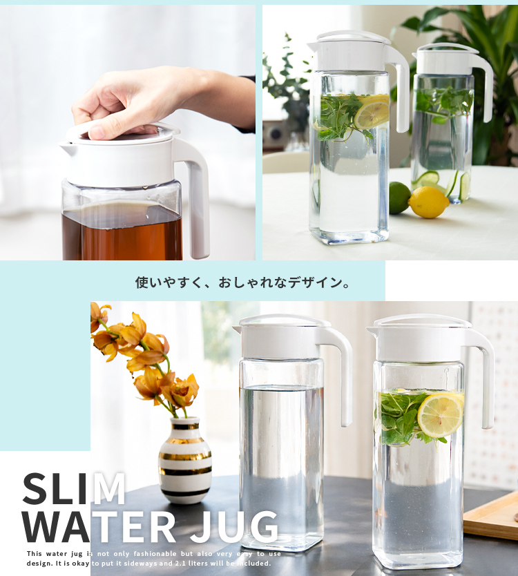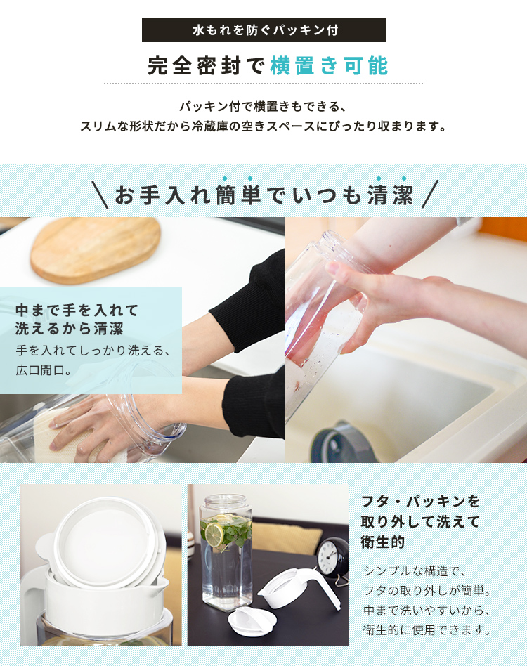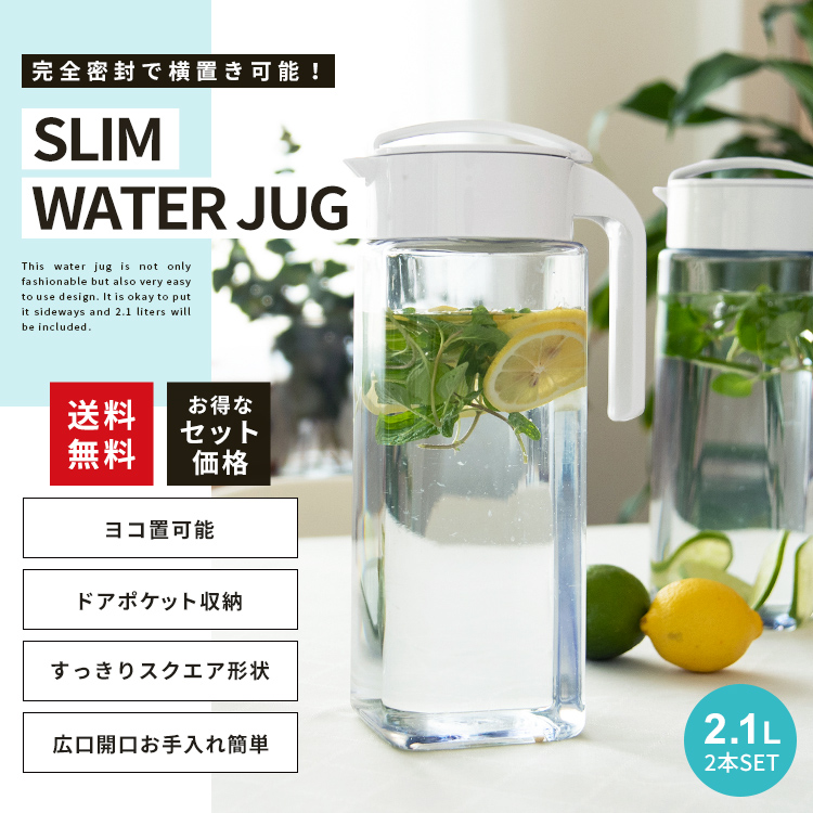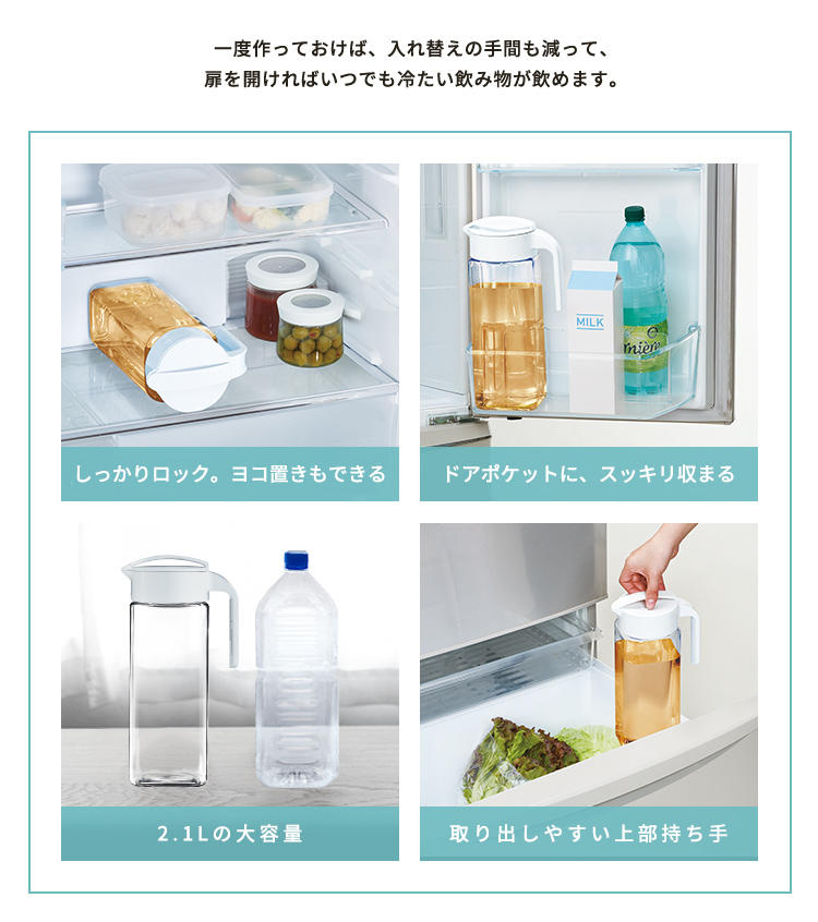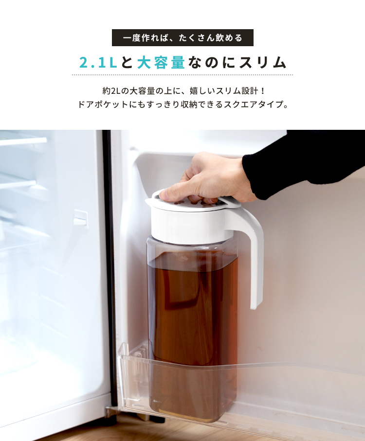 水漏れを防ぐパッキン付き。完全密封で横置き可能な冷水筒「ドリンクビオ」。完全密閉で寝かしても漏れないから、冷蔵庫でも横置きできます。また耐熱仕様で、麦茶などの煮出しも可能。無駄のないスクエア形状で、ドアポケットにもすっきり収納でき、横置きしても場所をとらず、冷蔵庫の空きスペースを有効活用できます。中まで手を入れられる広口設計なので、しっかり洗えて清潔。手にフィットするカーブが握りやすい形状で、片手でも使いやすいスタイリッシュなデザイン。冷蔵庫の収納にお困りの方にはぴったり。ファミリーサイズの2.1リットル・2個セットです。