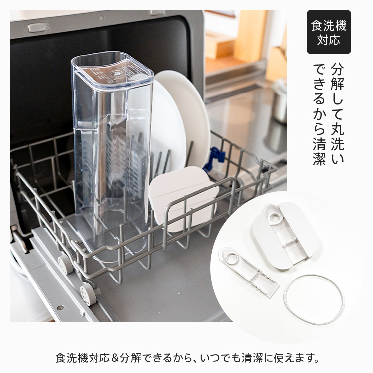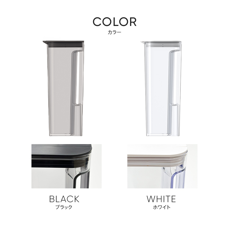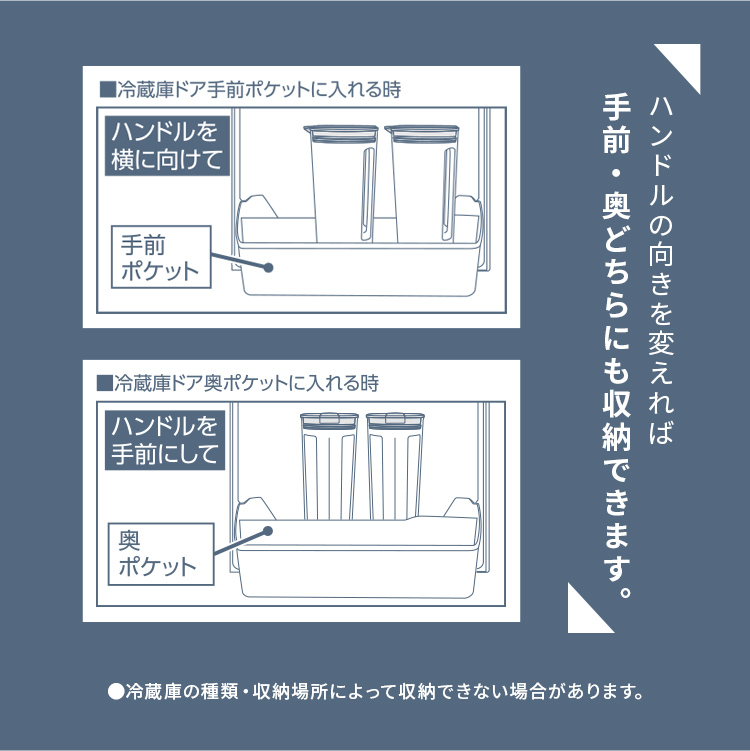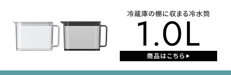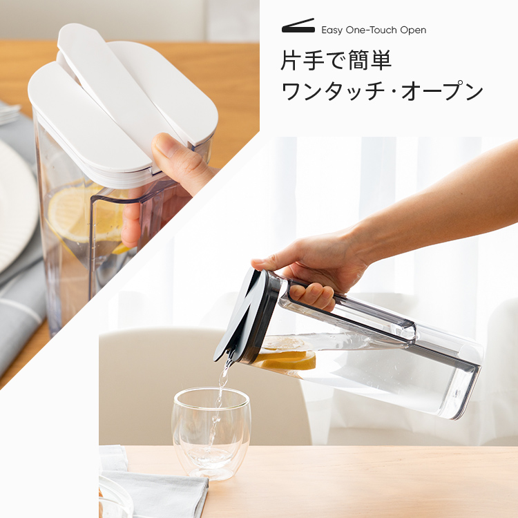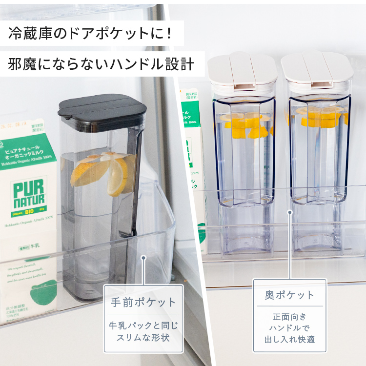 冷蔵庫のドアポケットにぴったり収まるピッチャー登場!ハンドル内蔵型でハンドルが邪魔になりません。ドアポケットのサイズに合わせて、収納する向きが選べます。ハンドル付きワンプッシュで操作できるので簡単に開閉。食洗機対応、部品も少ないのでお手入れも簡単です!耐熱仕様で、麦茶などの煮出しも可能。