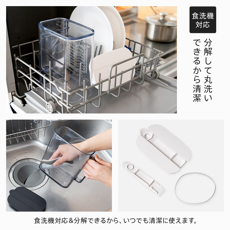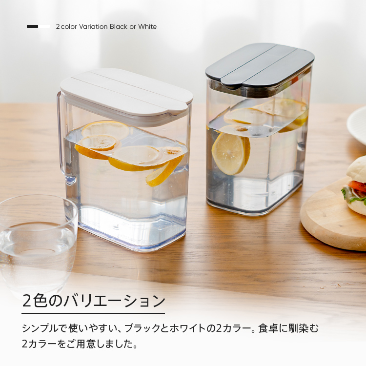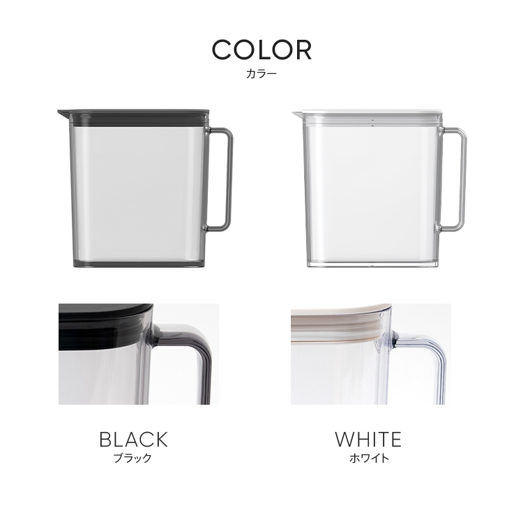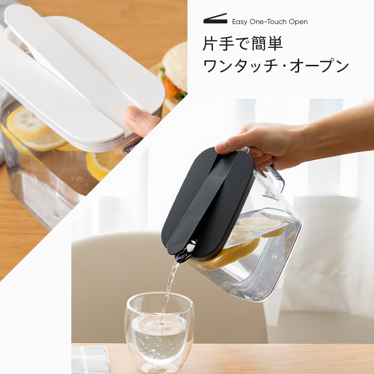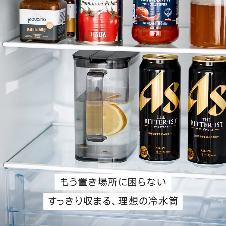 500ml缶と同じ高さで冷蔵庫の棚のすきまにぴったり収まるピッチャー登場!前ドアポケットにも収まるコンパクト形状。テーブル上にもぴったりのサイズ感です♪ハンドル付きワンプッシュで操作できるので簡単に開閉。食洗機対応、部品も少ないのでお手入れも簡単です!耐熱仕様で、麦茶などの煮出しも可能。