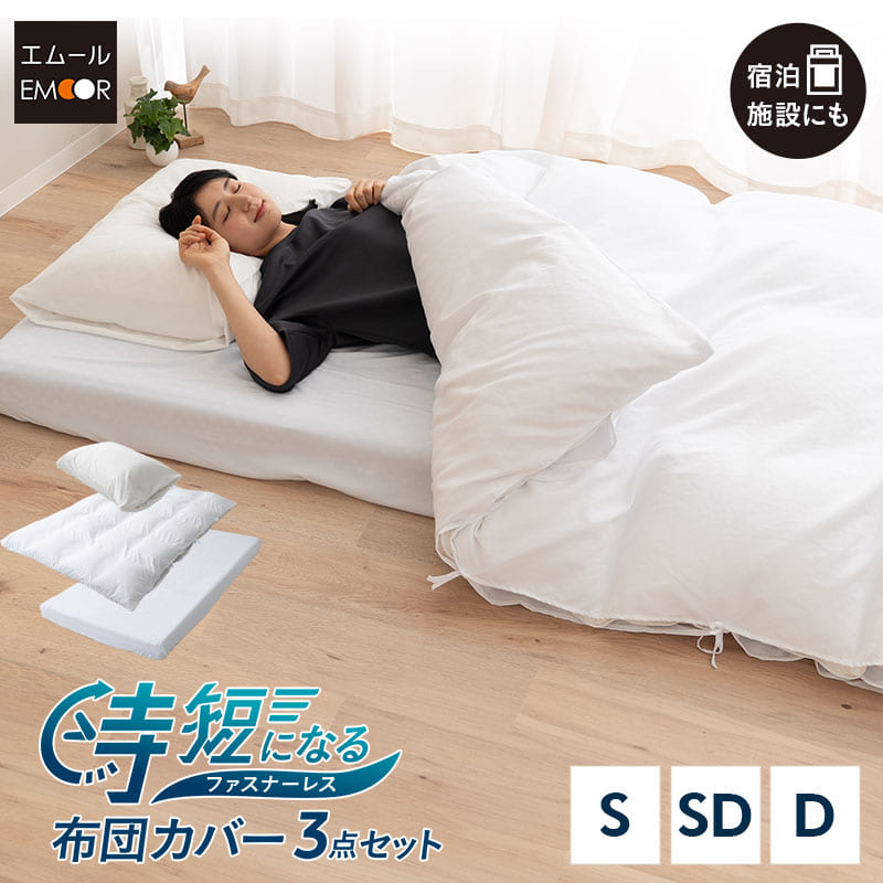布団カバーの付け外しにかかる手間をできるだけ小さくすることを目的に開発された、掛け布団カバー・敷き布団カバー・まくらカバーの3点セット。ファスナーレス仕様で、付け外しは約1分半で完了!頻繁な洗濯や交換を前提に、耐久性・速乾性に優れたポリエステル100%生地を採用。宿泊施設から一般家庭まで、長く・効率的に使えるメンテナンス重視のカバーセットです。
