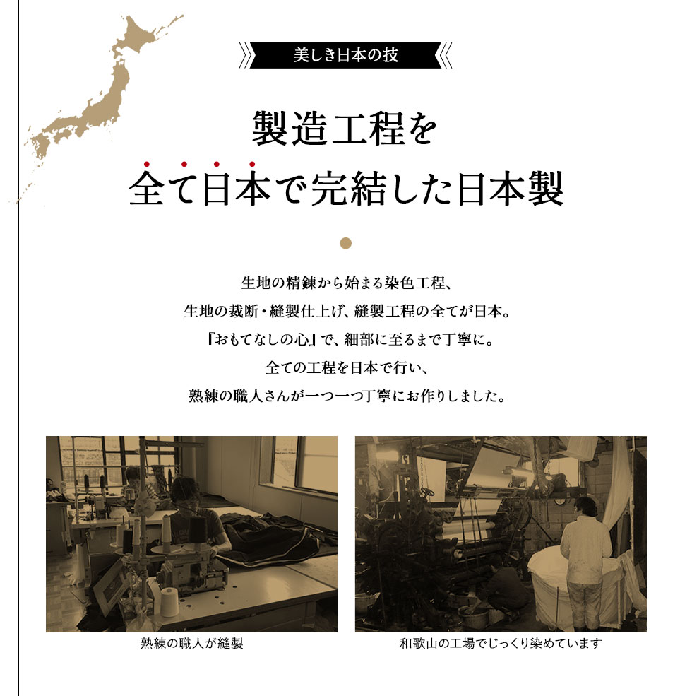 仕上げ、縫製工程の全てを日本で行い、熟練の