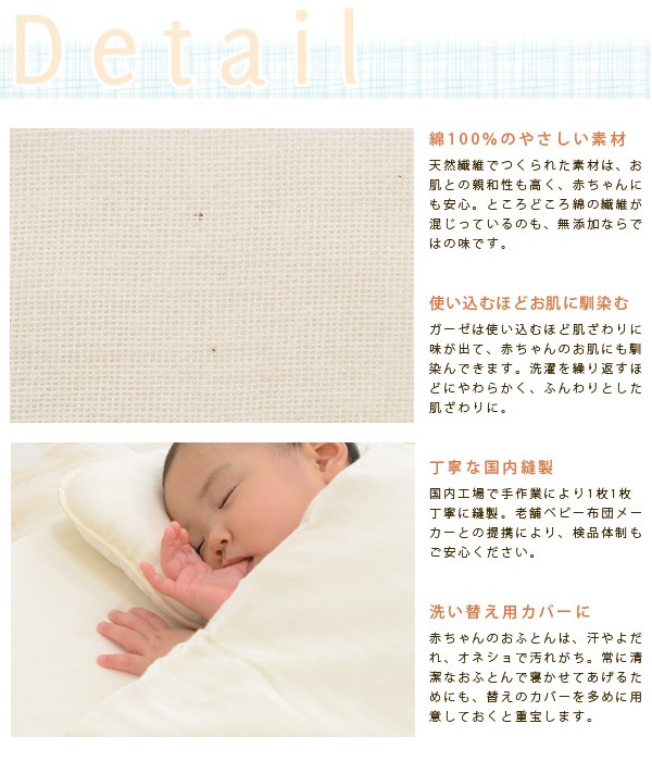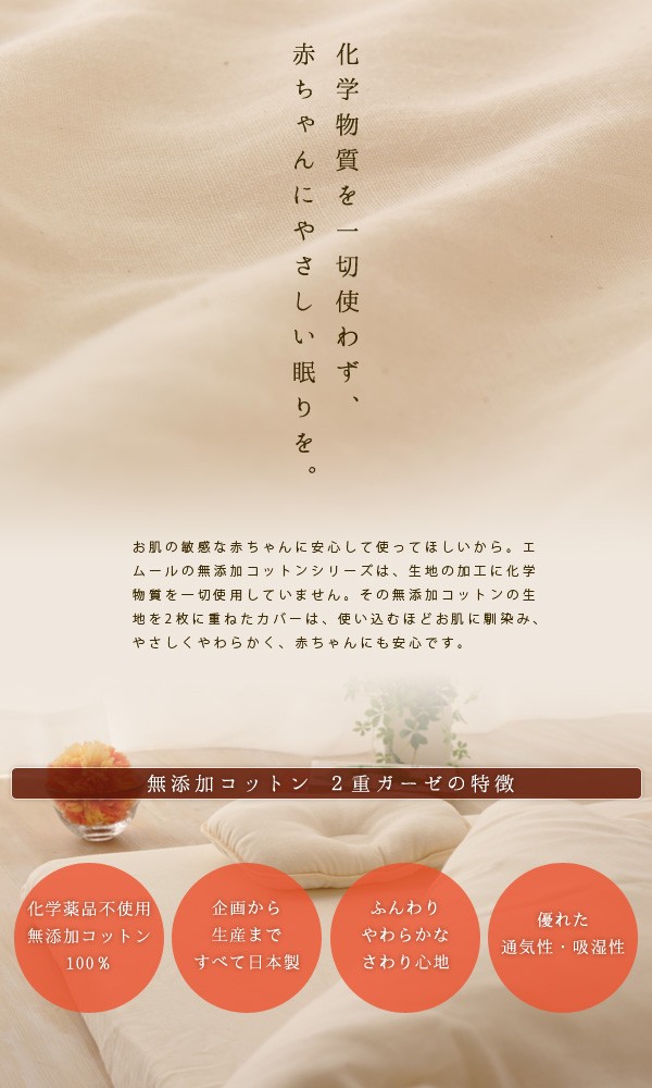 ■商品名 無添加コットン 2重ガーゼ ミニサイズ ベビー掛けふとんカバー■サイズ ベビーサイズ:約80×100cm■素材 綿100%(化学薬品不使用 無添加コットン2重ガーゼ)■カラー 生成り■生産国 日本製■お手入れ方法・40℃以下の水温で洗ってください(ネット使用)。・型崩れや縮み原因となる回転式乾燥機によるタンブラー乾燥は避けてください。・干していただく際は、四方のシワを軽く伸ばし形を整えて下さい。■配送送料区分は100サイズです。配送料金の詳細はこちら 離島のお客様は別途お見積りをいたします。■発送まで2〜5営業日以内に出荷いたします。 ポイント利用