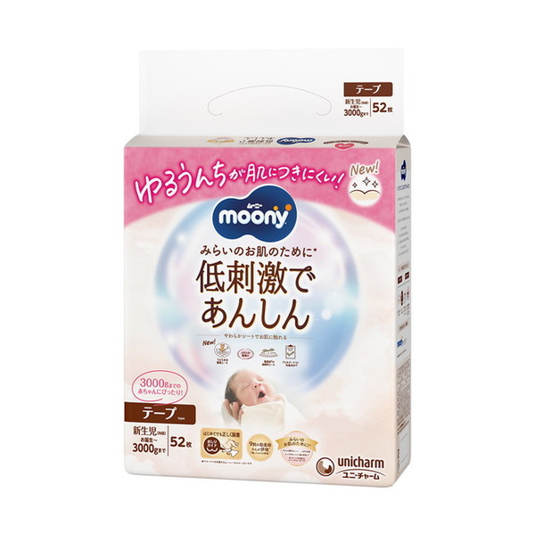 商品名:ユニ・チャーム ムーニー 低刺激であんしん 新生児 お誕生~3000g 52枚入 こども用紙おむつ