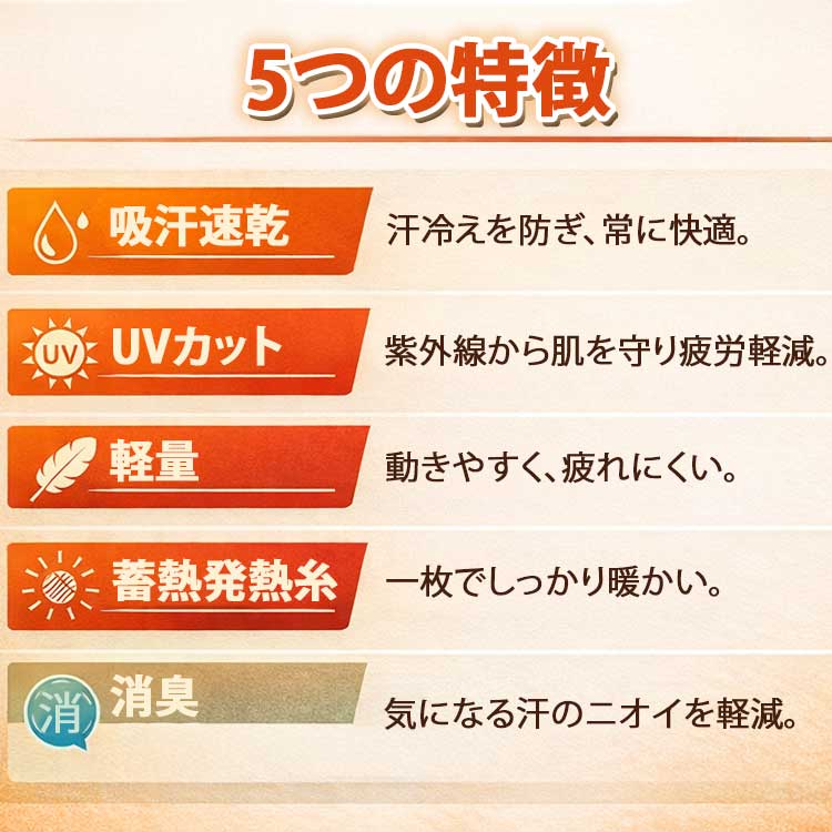 ……汗を吸収してさらさらの着心地。吸収した汗を素早く気化して汗冷えを防ぐ。