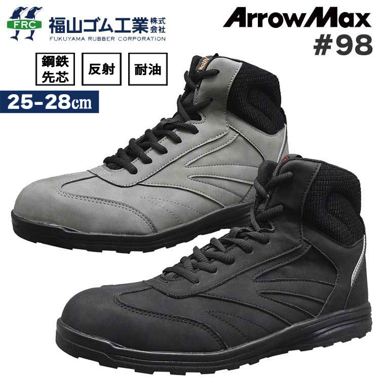 安全靴 鋼鉄先芯 スニーカー #98 アローマックス 耐油 反射 ブラック グレー メンズ ファスナー付き 靴紐 ミドルカット おしゃれ 安全スニーカー 先芯 福山ゴム