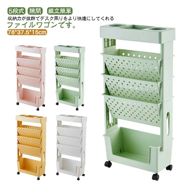 | 収納力が抜群でデスク周りをより快適にしてくれるファイルワゴンです。 仕切り板が斜めに設置されるので、背表紙が見やすくファイルなどが取りやすい構造です。 本棚は大容量で、上段には雑貨、下段には漫画や雑誌などの本を入れることができます。 4つのキャスター付きで360°自由に回転し、固定用ロックが付いて、キャスターをロックすることができます。 縁が滑らかでバリがないので、手を切らないように使います 。 キッチン・オフィス・トイレ・ベッドルームなど様々な場所に適しています。 | |