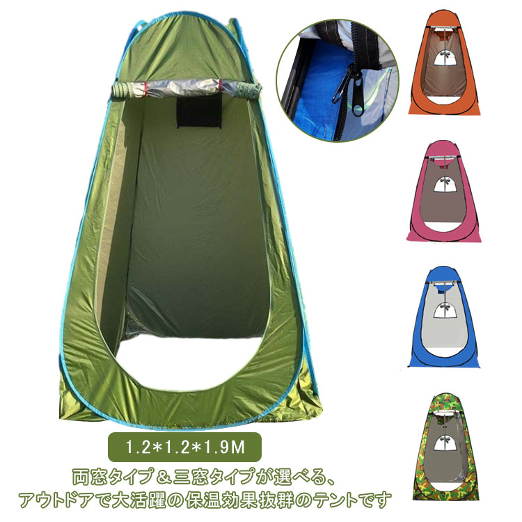 両窓タイプ&三窓タイプが選べる、アウトドアで大活躍の保温効果抜群のテントです。三窓タイプはシャワーヘッド対応!女性でも安心の、パッと開いてサッと使えます。海水浴やコスプレ会場などでの着替えルームとして、 コンパクトに収納できるので、持ち運びも簡単です。キャンプや災害時にも、周りの目や時間を来にせずに使用できる便利アイテム!遮断性に優れた素材で、雨や有害な紫外線を遮断してくれます。釣り&農作業での休憩場所やトイレ代わりなど いろいろな場所で工夫次第で利用可能。 | |