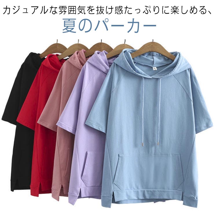 ポッケト カットソー パーカー 半袖 フード付き Tシャツ スリット シンプル コットン パーカー レディース トレーナー プルオーバー トップス 綿