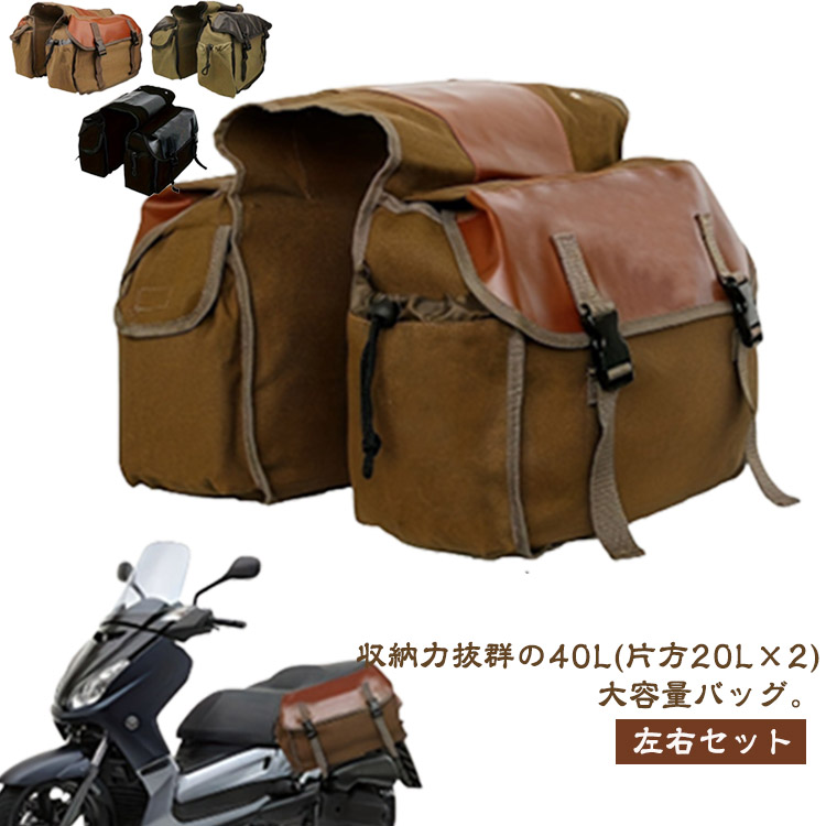 | 収納力抜群の40L(片方20L×2)大容量バッグ。【左右セット】 サドル左右装着で荷物の分別収納可能 脱着が容易なので、汚れても取り外して水で洗えます。(耐久性が高いキャンパス生地) ほぼ全ての車種に取付可能。左右バッグ距離32cm | |