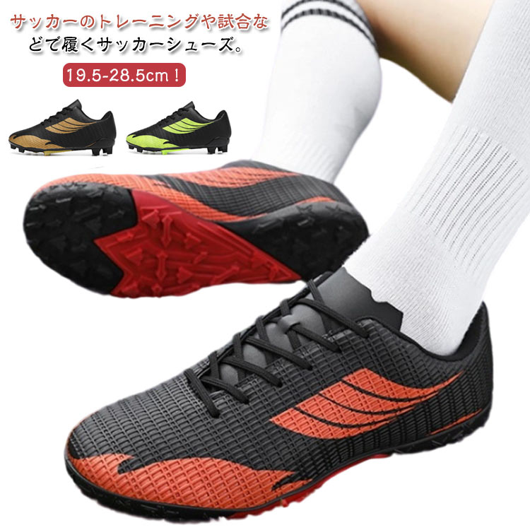 | 19.5-28.5cm!サッカーのトレーニングや試合などで履くサッカーシューズ。 靴底にはスタッドが付いて、グリップ力が強くて、滑りにくく丈夫なので、スポーツシューズとしては最適。 全体的に足にフィットするように作られており、適度なクッション性もあります。 上品なPUを使用し、柔らかい素材感と耐久性があり、機能性を保証できます。 おしゃれ感が溢れ、男女に問わずジュニアの通学用など利用する方におすすめ。 土グラウンド、天然芝、人工芝に対応しています。 | |
