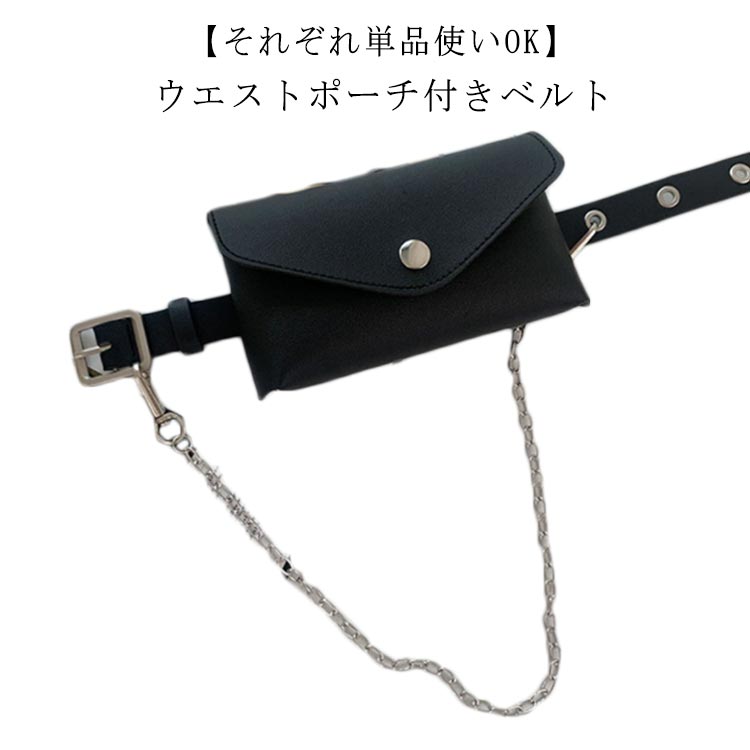 | ウエストポーチ付きベルト 【それぞれ単品使いOK】 チェーンが付いてエッジのきいたベルトは、ウエストマークができるので、自然とスタイルアップも叶います☆ もちろんベルトとポーチをそれぞれ取り外して個々での使用も可能です。 スマホや小さめの財布、キーケースなどの収納にちょうど良いサイズ感。 滑らかな手触りとマットな質感が美しい合皮素材を使用。 | |
