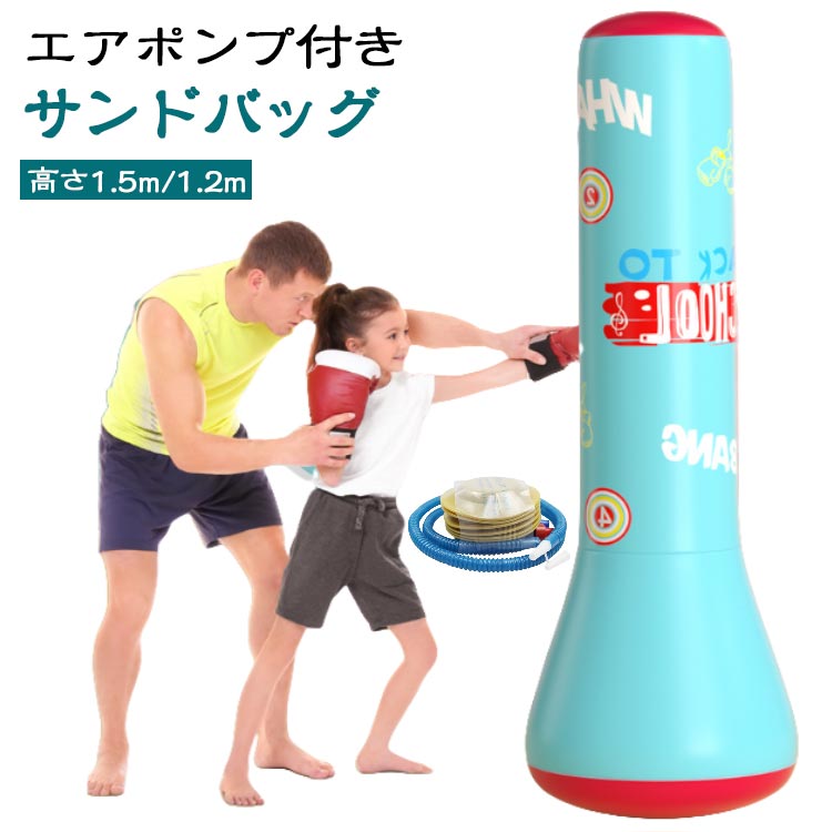 | エアポンプ付き サンドバッグ 高さ1.5m/1.2m 下の「重り」になる部分に砂をいれたあと、付属のエアポンプ(空気いれ)を使って、パンチングバッグをふくらませて下さい。 ローキック、股関節ストレッチ、バスケパスの練習等でご使用ください。 ストレス解消パンチングバッグは、パンチとキックの有酸素運動で、ストレス解消やボディシェイプをサポートする空気式のスタンディングサンドバックです。 起き上がり小法師(おきあがりこぼし)のように、倒しても起き上がり、返りが早いので素早い動きができます。 本体は、ビニール素材、バック内は空気なので、殴る、蹴るをしても、手や脚に負担がかかりません。 空気式だから女性でも軽く扱いやすいスタンド式サンドバッグです。 ボクササイズ、ローキック、股関節ストレッチ、バスケパスなど、アイデア次第で様々な全身筋肉エクササイズができるストレス発散グッズ。 女性のダイエットやエクササイズ用だけでなく、子どものストレス解消法にも!!低学年のお子様の格闘技(空手、少林寺、キックボクシングなど)の練習用にも人気です。 大人が子供と一緒に遊べるおもちゃ、グッズとしてもおすすめのエアースタンディングバッグ。 エアーポンプで膨らませるタイプの自宅用サンドバッグだから、使わない時には、空気を抜いてコンパクトにたためるので、収納にも便利なパンチングスタンドです。 | |