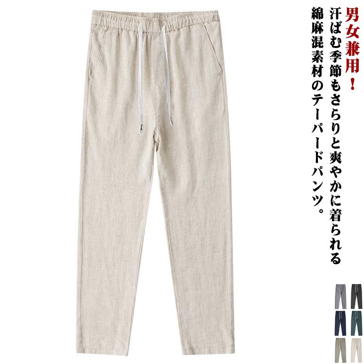 | 男女兼用!汗ばむ季節もさらりと爽やかに着られる綿麻混素材のテーパードパンツ。 ややゆるっとしたルーズなテーパードシルエットが魅力的。 夏にぴったりの清涼感ある麻混素材はさらりとした快適な穿き心地を実現! ウエストはゴム仕様なので穿き心地も良い! | |