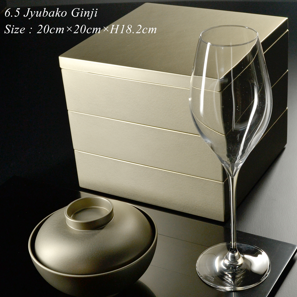 | product_information ■6.5寸・20cm三段重 銀地 ■本体価格:13,500円(税別) ■サイズ:20cm×20cm×H18.2cm(1段内寸 19cm×19cm×H5cm) ■重さ:1510g ■レンジやオーブンには使用しないで下さい。 製造に関して この商品は以下の工程で製造しています。 生地(直圧成型)⇒研ぎ⇒銀地ウレタン塗装⇒クリアウレタン塗装⇒焼付け乾燥 ■ここがこだわり! 『銀』の色はモダンな印象を与えますが、ともすると安っぽくなりがちな色です。なので、この『銀地』は蒔絵のすこし錆びた『銀』をイメージにする事で落ち着きと高級感を表現しました。 陽射しの強い場所や白色系の蛍光灯の光量の強い場所では白っぽく、 おそらく市販ではあまり見かけない当社のこだわりの『銀』です。 商品説明 ■この銀色は塗料で塗っていますが、塗料の銀は下品になりがちです。艶消しにする事と、白くなりすぎないようにする事で品良く仕上げました。 シャープなフォルムに落ち着いた銀色なので色んな場面でテーブルを着飾れるデザインの重箱です。 大きさは一般的なサイズの重箱なので、お節料理にはもちろんですが、パーティーのオードブルなど大人数でのお食事にお洒落に使えるお薦めの商品です。 ■用途 :重箱 ランチボックス オードブル お弁当箱 |