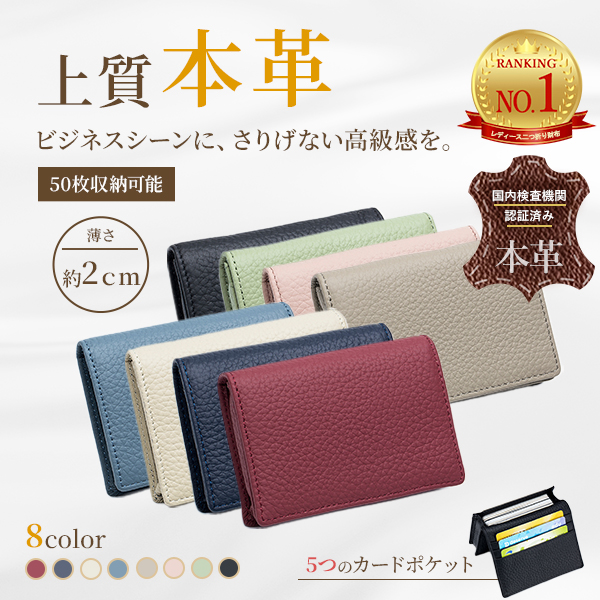シンプルかつ機能的な本革名刺ケース。名刺は最大50枚まで収納でき、急な商談やイベントにも余裕をもって対応できます。5つのカードポケット付きで、交通系ICカードやクレジットカードもまとめて管理可能。財布代わりに使えば、ちょっとした外出もスマートに。素材は上質な牛革を使用しており、使い込むほどに手に馴染む風合いへと変化。約2cmのスリム設計でポケットやバッグでもかさばりません。洗練されたデザインはビジネスシーンはもちろん、カジュアルな装いにも自然と馴染みます。大人の身だしなみとして一つは持っておきたい、実用性と品格を兼ね備えた名刺入れです。