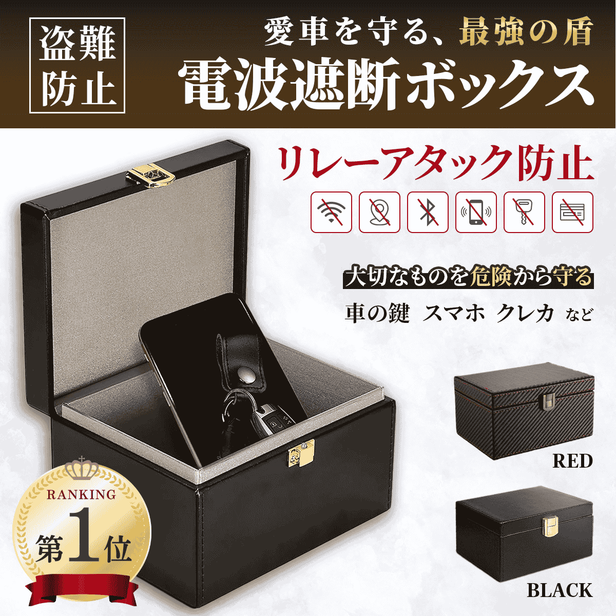 電波遮断を行いリレーアタックから車やバイクの盗難対策としてご利用ください。本商品の中へスマートキーを入れて蓋をして金具をロックすることで外に電波が漏れなくなりリレーアタックから守ります。奥行や高さがあり、大容量ですので複数のスマートキーやスマホを収納できます。iPhone Proシリーズも対応。高級感溢れるデザインですので、どのお部屋にもマッチして収納ボックスとしても併用できます。スマーキーの他にもクレジットカードのスキミング防止、スマホの位置情報などの防止にもご使用いただけます。●仕様 生産単位によって寸法に差異がある場合がございます。・外径サイズ 画像参照・内径サイズ 画像参照・対応スマートフォンサイズ 4.7インチまで・重量 約370g・素材 PUカーボンレザー●留意事項本商品を使用し、発生した事故や損害については一切の補償を致しかねます。■注意■・ボックスのみの販売となります。トヨタ ホンダ 日産 アルファード ハイエース プラド