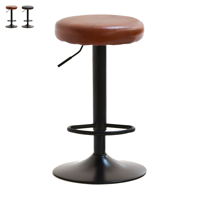 シンプルな丸型の座面が特徴のカウンターチェア、バーチェア。ボリューム感ある厚手の座面で、座り心地も◎。テーブルの高さや座る人の身長に合わせて、レバー1つで635〜835mmの間で座面の高さを調節できます。座面が360度回転するので、どこからでも立ち座りでき、椅子を引くぶんのスペースが必要ないのが強みで、脚元には足置きもついているので、シンプルながら使いやすいデザインとなっています。