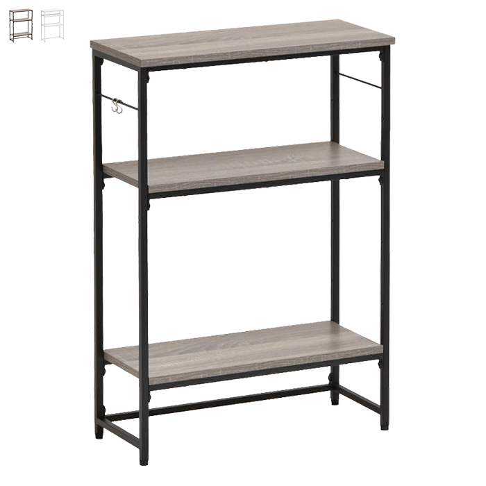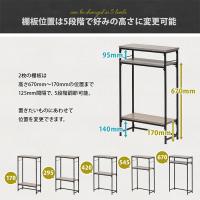 棚板の取り付け位置は5か所の中からお好みに合わせて選択頂けます。シャープで圧迫感の無い落ち着いたデザインとしておりますのでリビング、キッチンカウンター下の収納、サニタリー収納等、設置場所を選ばないマルチなラックとしてご使用可能です。フレームの両サイドにはフックを引っ掛けることも可能で、フックが2つ付属しております。