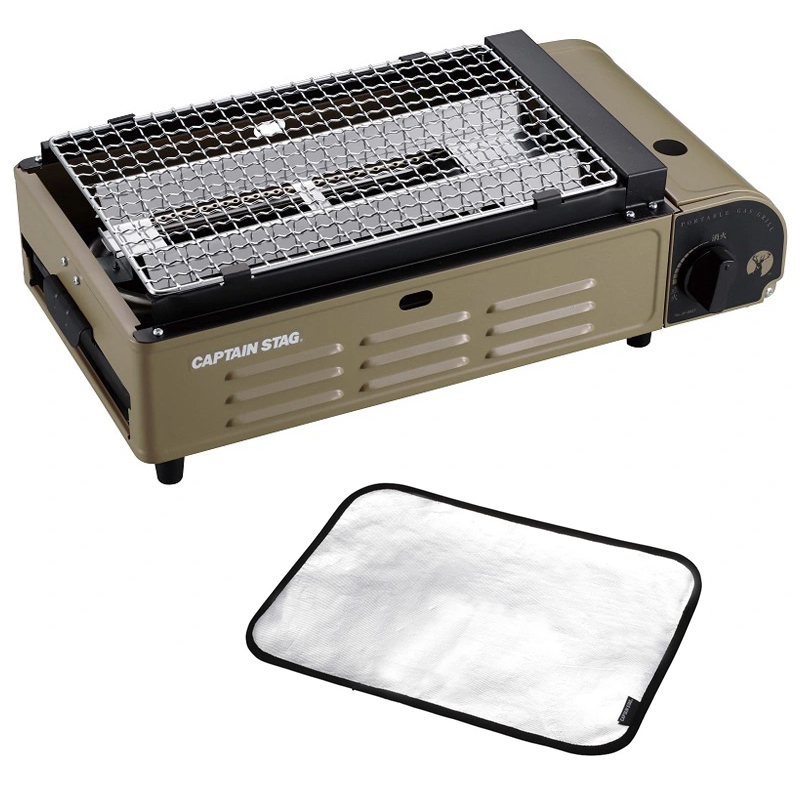 商品説明 【ガスバーナーシート(ワイド)】 ●材質:表地/アルミ蒸着シート、裏地/アラミド繊維 ●サイズ(約):幅450×奥行330mm ●ガス器具や調理器具からの輻射熱や吹きこぼれを防ぐシートです ●耐熱性・難燃性・強度に優れたアラミド繊維を使用 ●カセットコンロに最適なワイドサイズ! 仕様/規格 【焼き名人 卓上 カセットコンロ】 ●材質:本体・ボンベカバー・水入れ/鉄(粉体塗装)、バーナー・輻射熱板/ステンレス鋼、焼き網/鉄(クロムめっき)、器具栓つまみ/ABS樹脂 ●外形サイズ(約):幅398×奥行221×高さ130mm ●本体重量(約):2.2kg ●点火方式:圧力点火方式 ●安全装置:圧力感知安全装置 ●火力:2.3kw(2000kcal/h)※周囲温度20〜25度、ガス消費量・使用時間は表示火力に基づく理論値で、実際とは異なる場合があります。 ●ガス消費量(約):165g/h※周囲温度20〜25度、ガス消費量・使用時間は表示火力に基づく理論値で、実際とは異なる場合があります。 ●使用ガス:ブタンガス ●使用容器(容量):No.M-7621キャプテンスタッグガスカセットボンベ3本パック(1本:250g) ●使用時間:250g/約90分(ボンベ1本) ●PSマークの種類:PSLPGマーク/届出事業者名:パール金属株式会社/登録検査機関名称:JIA(日本ガス機器検査協会) メーカー品番 関連商品 キャプテンスタッグ 焼き名人 卓上 カセットコンロ 対象ユーザー |
