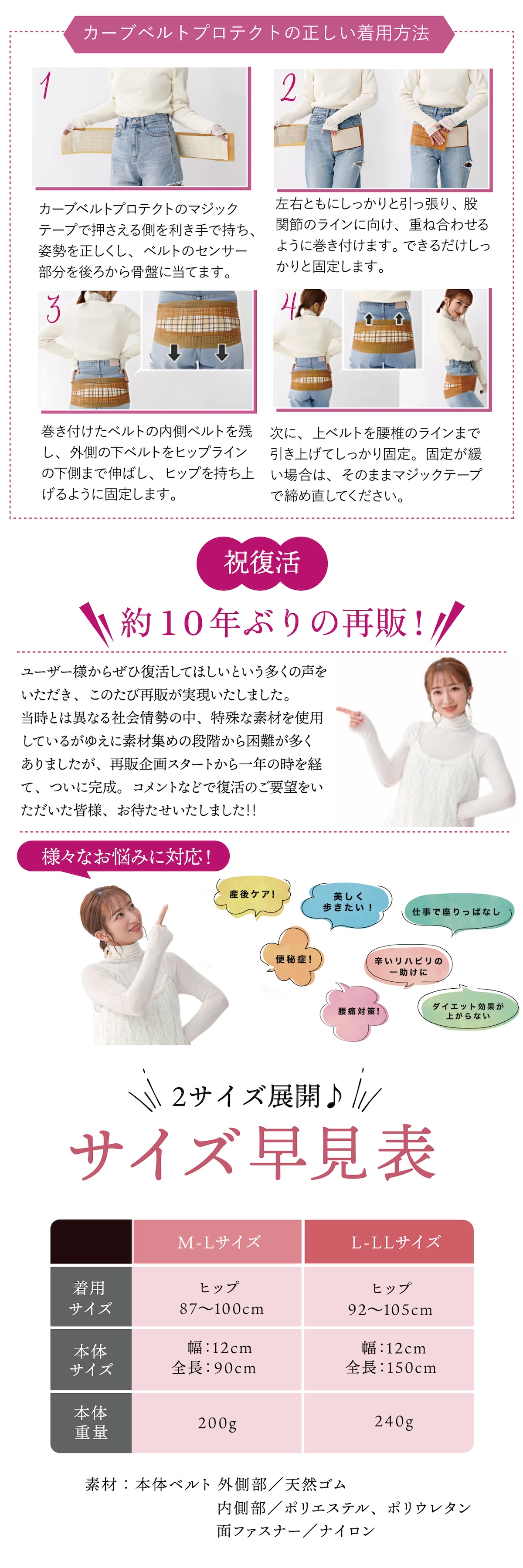 ・サイズ:M〜L:ヒップ87cm〜100cm/L〜LL:ヒップ92cm〜105cm