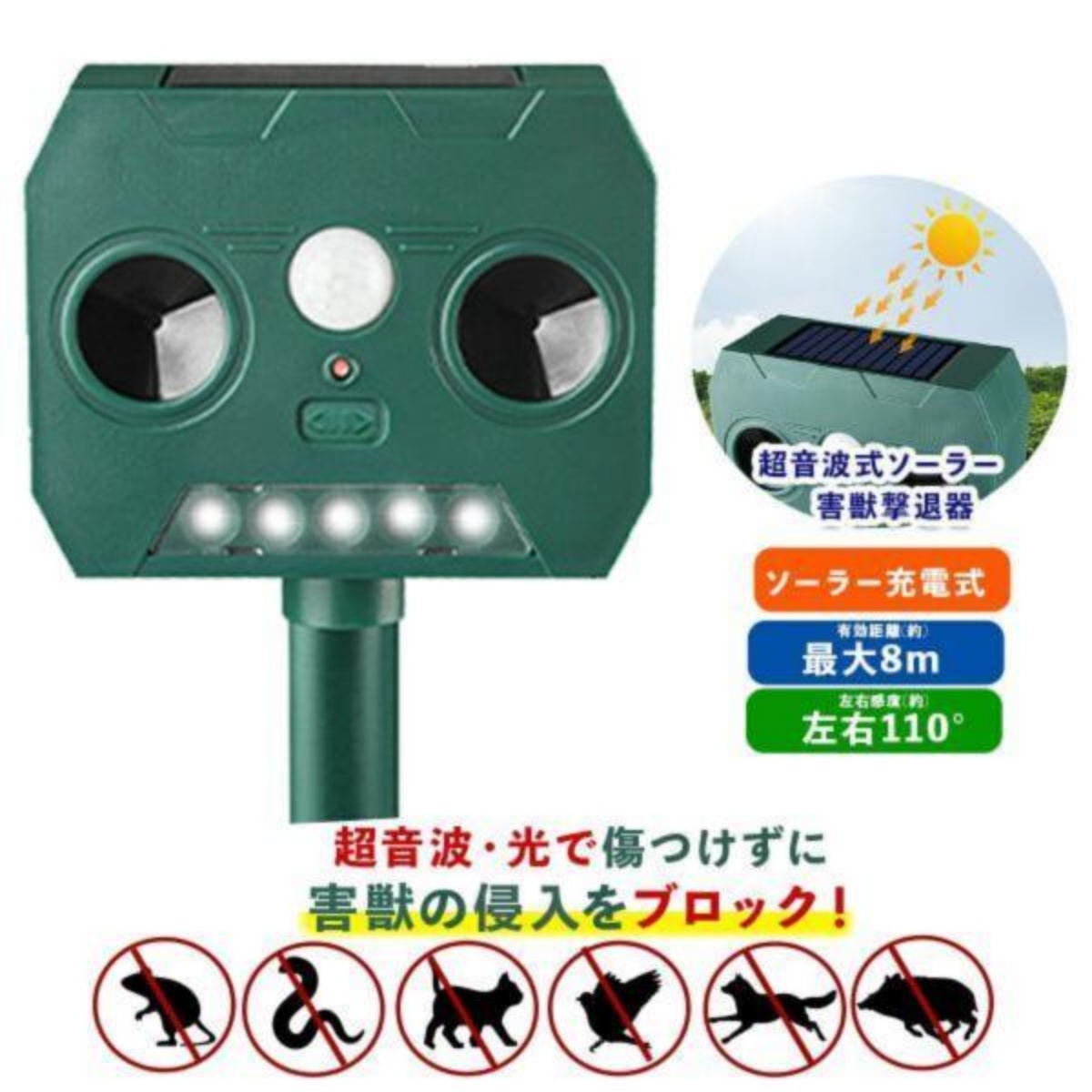 配線不要!電気代0!電源不要の超音波ソーラー式害獣撃退器! ≪罠を使わず! 薬物を使わず! 危害を加えず!追い払う≫