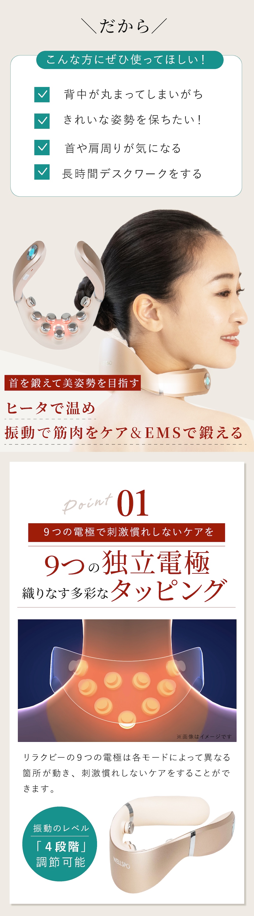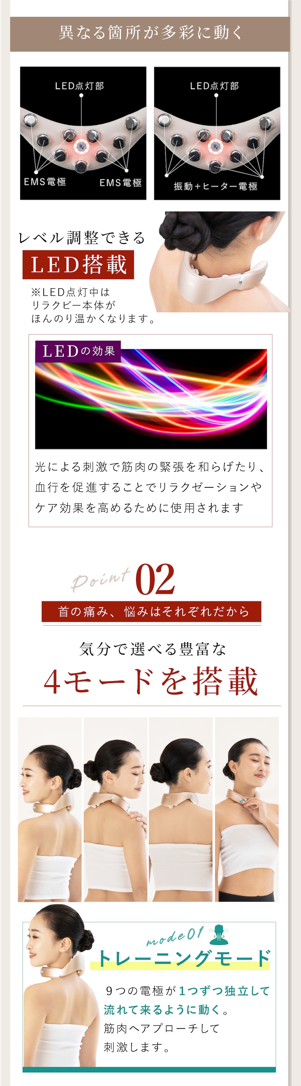 〈リラクビーの特徴〉 刺激慣れさせにくい9つの独立した電極が織りなす多彩な動きで首トレが手軽にできます。