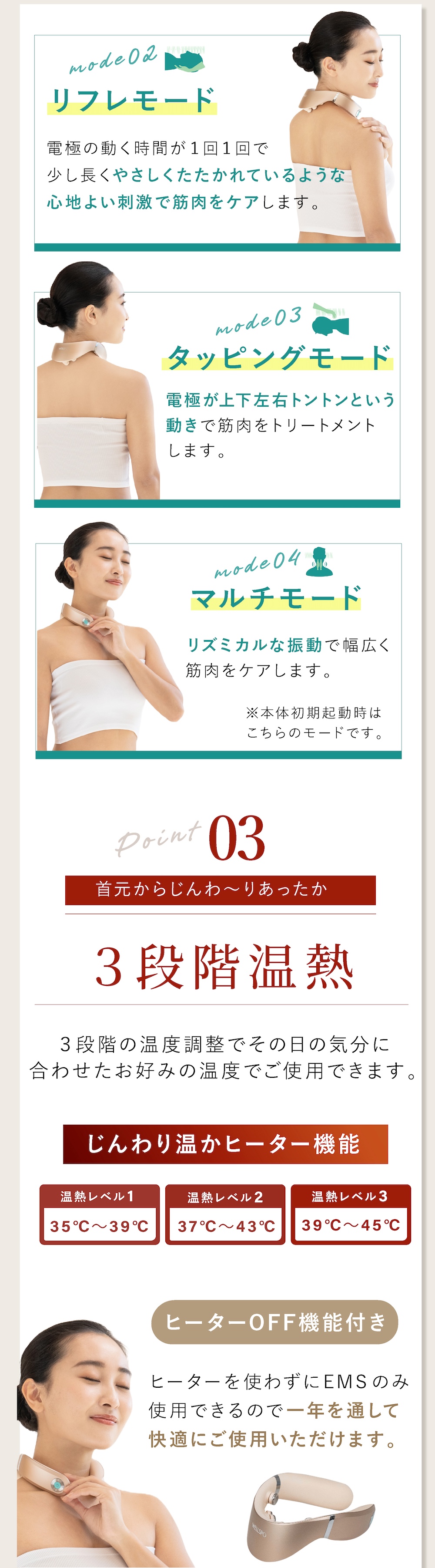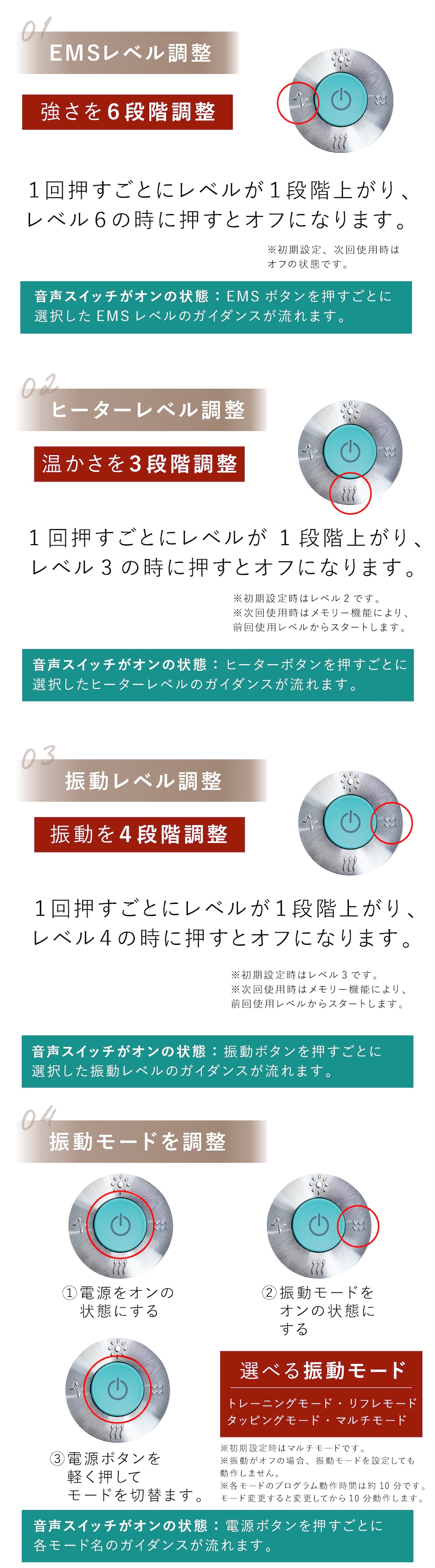 振動レベルは4段階に調節可能。EMSは6段階に調節可能、オリジナルパルスで広く深くアプローチ。じんわり温かなヒーター機能は3段階で調節可能。気分で選べる豊富な4つのモード。