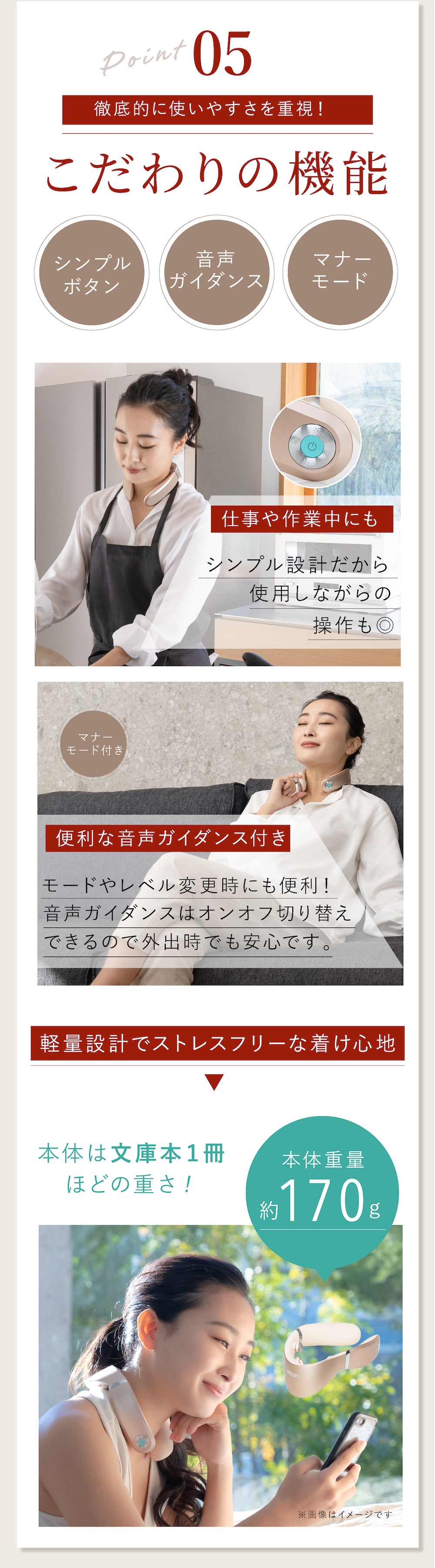 使用しながら操作できるシンプルボタンに加え、オンオフ可能な音声ガイダンス機能採用でさらにわかりやすく。約170gの軽量設計で快適なつけ心地を追求。