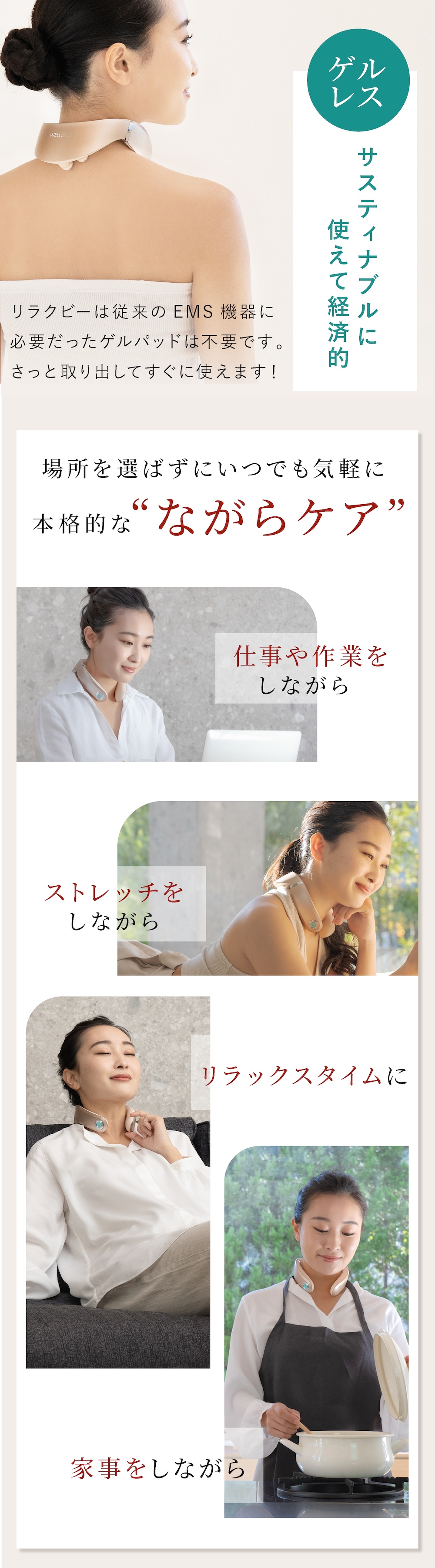 くつろぎながら、家事をしながら、家事をしながら、コードレスだから利用シーンを選ばず、首トレしながら美姿勢を目指せます。