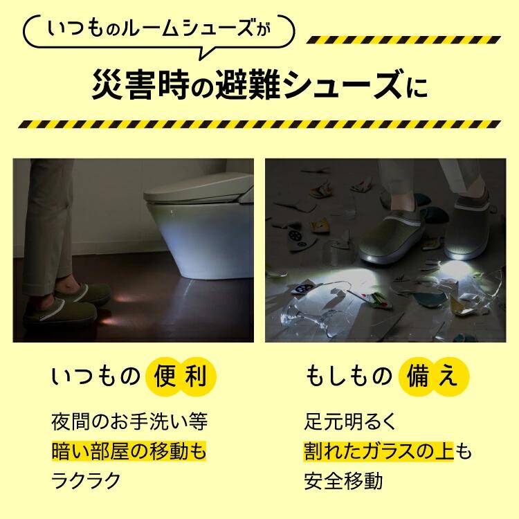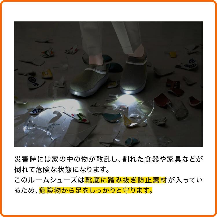 光るルームシューズ!夜間時の移動などにも役に立ち、災害時にも安心の発光力。つま先の補強と靴底のふみ抜き防止素材で室内用の安全靴としても抜群の機能性。防災アドバイザー高荷智也さん徹底監修!プロの目線から理想的な災害の備えを実現。