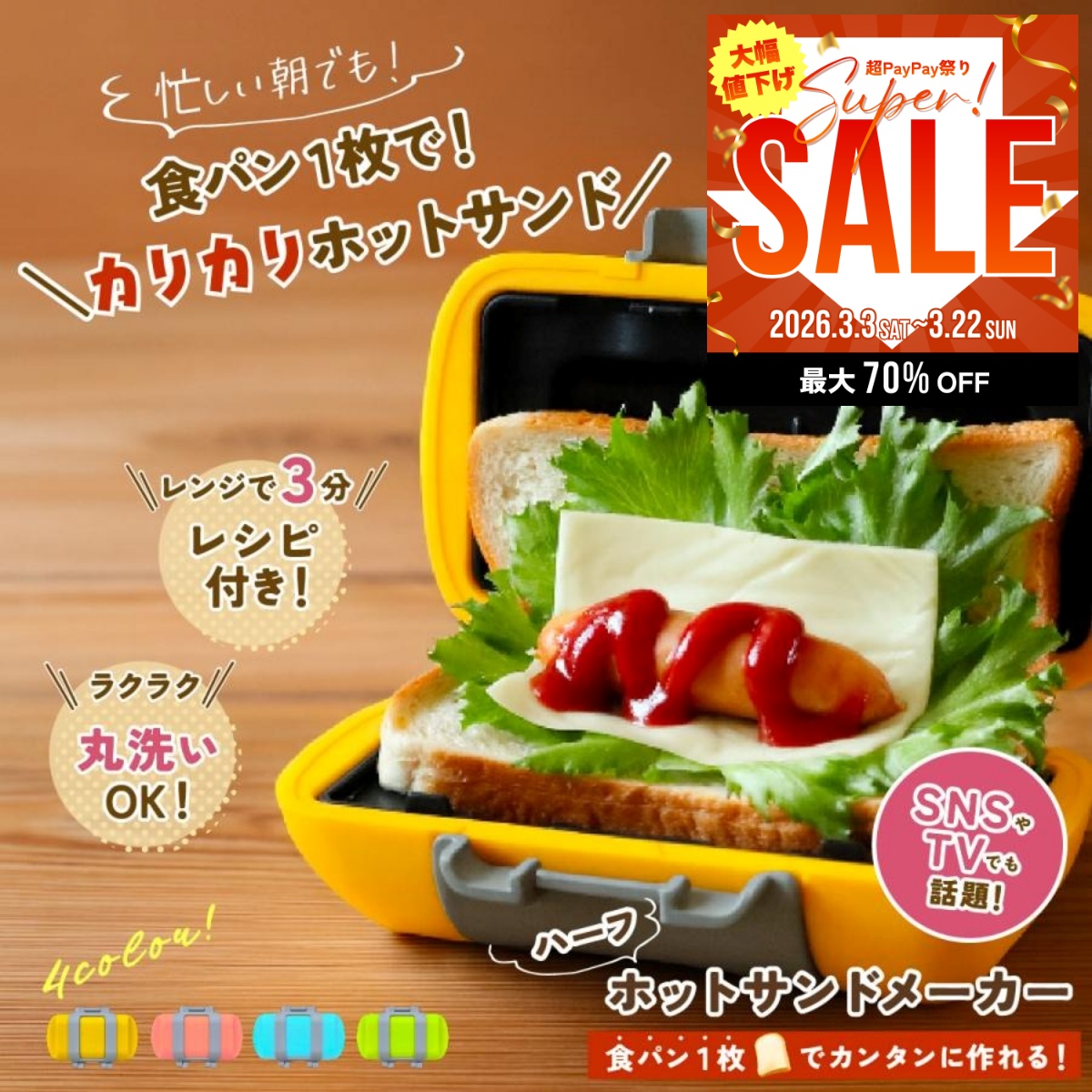 レンジで3分※!カリッと焼ける、ハーフホットサンドメーカー
