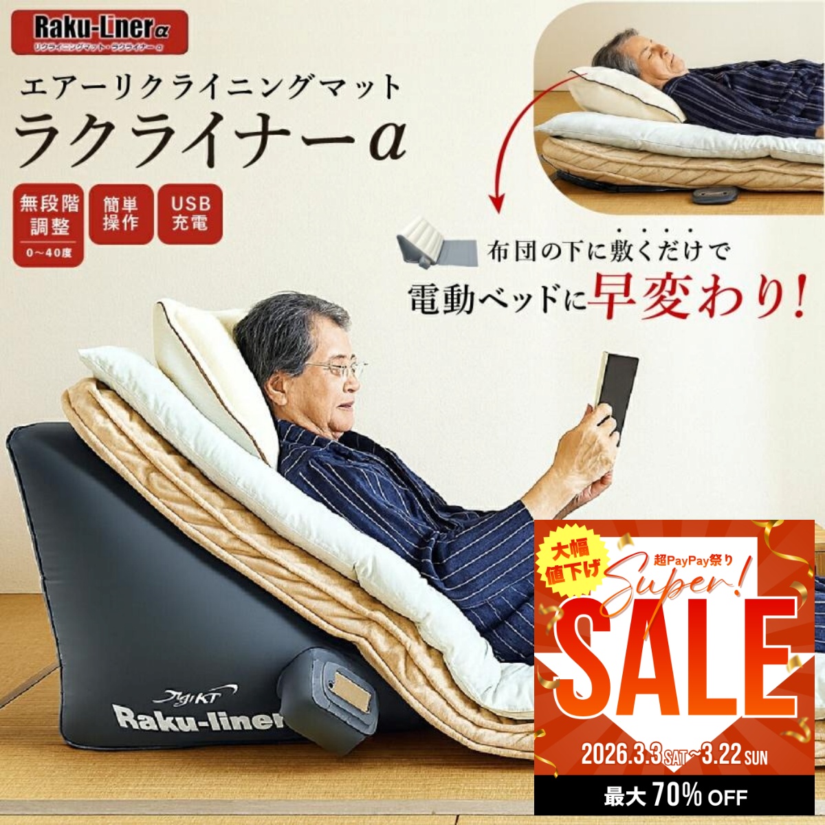 | ラクライナー, ラクライナーA, エアーリクライニング, 電動 リクライニング, 布団 リクライニング, 充電式, コードレス, 介護 補助, 起き上がり サポート, 静音, 無段階角度, 0〜40度, 在宅介護, 省スペース, 電動ベッド, 介護ベッド, 起き上がり補助, AX-065 | |