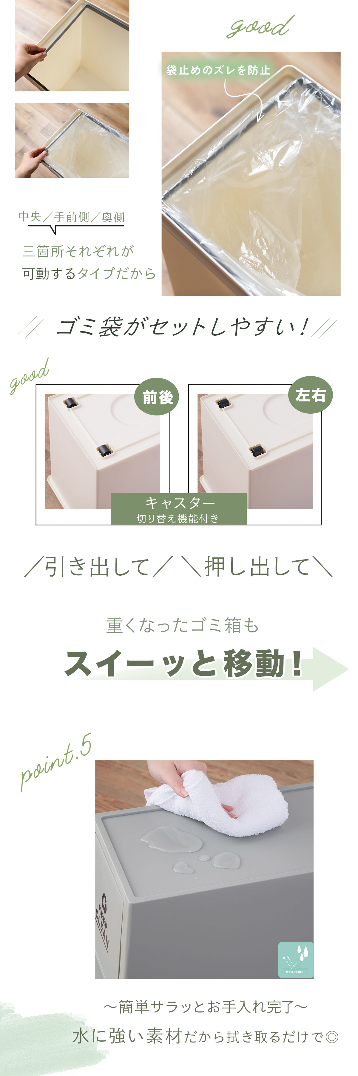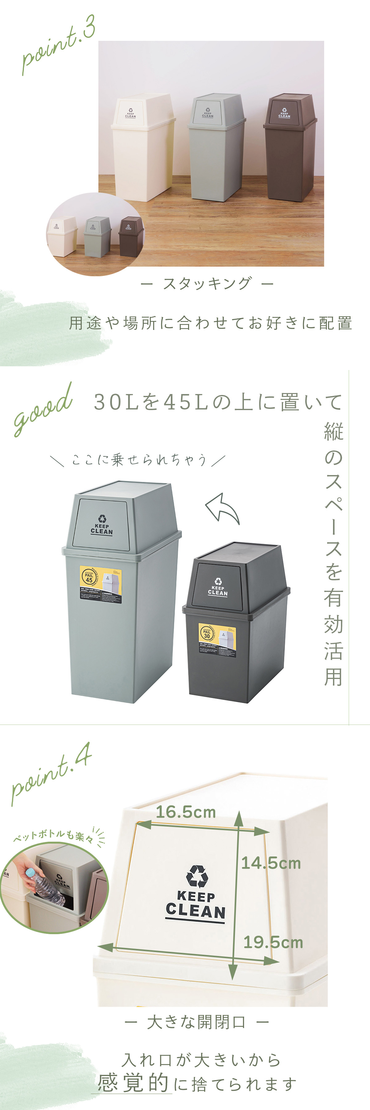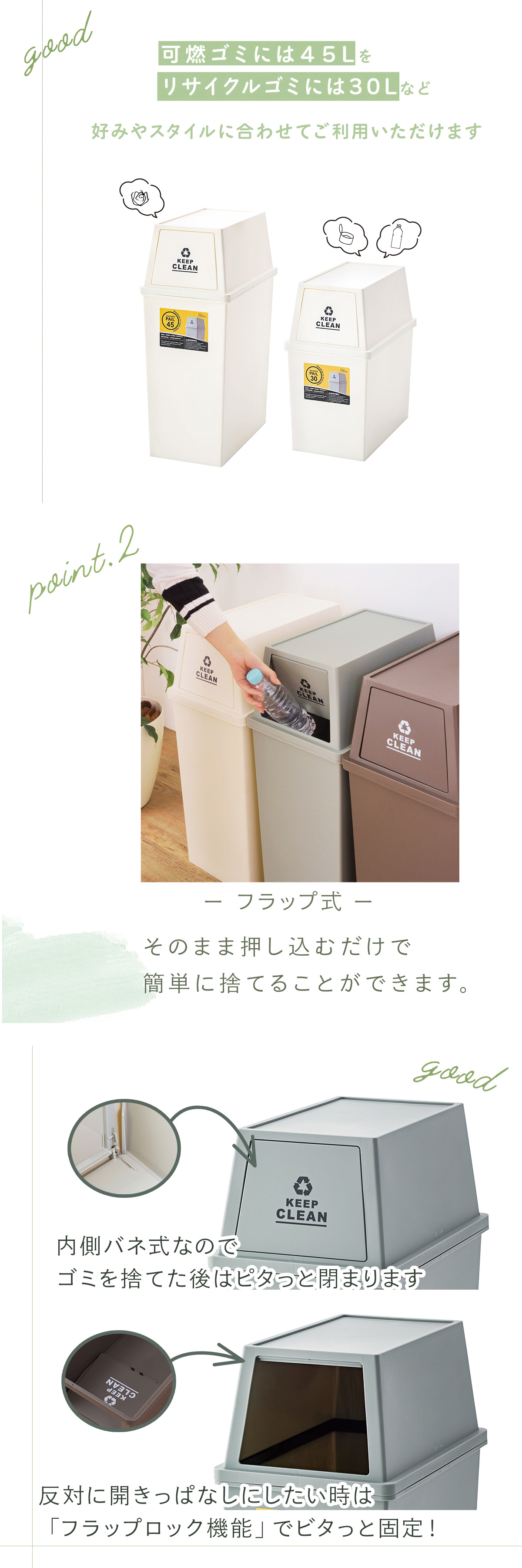 縦の空間を有効活用し、すっきりと分別できます。サイズ違いで積み重ねも可能なので、用途に合わせてお選びいただけます。使いやすいフラップ式高さを抑えた設計で、カウンター下などにもおすすめ。フタ部分を軽く押すだけで開くフラップ仕様なので、省スペースでも快適に使えます。嬉しいキャスター付き置き場所に合わせて移動もラクラク。