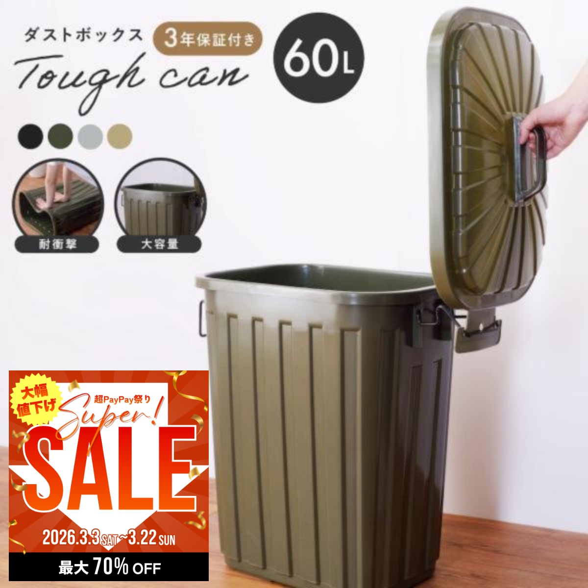 車がぶつかっても元に戻るほどの復元力のあるタフなボディのダストボックス。高品質な日本製で、万一破損が生じた際にも安心な3年間の保証付きです。(※正常使用範囲内で割れ、破損が生じた場合。留め具・取手カバー除く) 60リットル分の容量があるので、大容量のゴミ箱としても、掃除道具やキャンプ用品、遊具などを収納するのにも便利です。