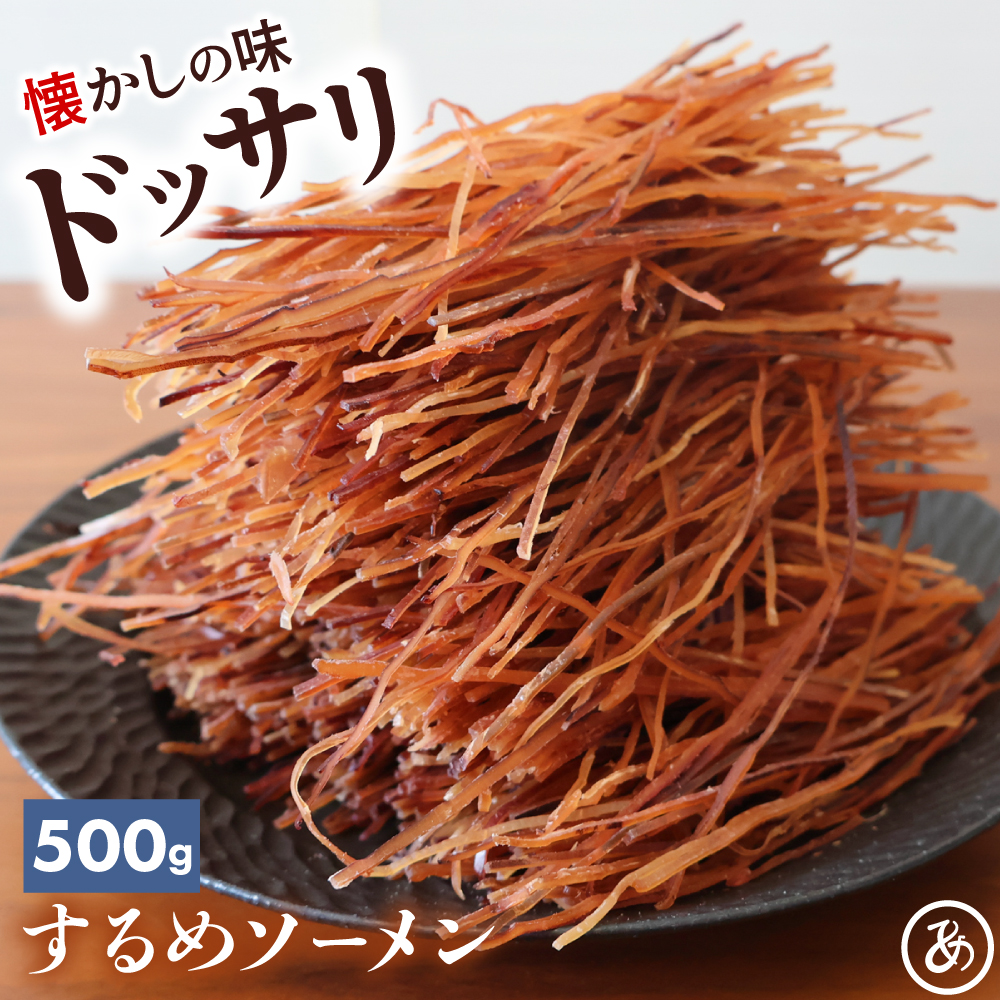 懐かしい味わいで駄菓子珍味の定番のするめソーメン。どっさり500gと大容量で食べ応えも抜群、業務用にも最適な商品です。端材ではなく一本タイプのイカの耳を贅沢に使用しており、イカの旨みとコリコリ食感を愉しんでいただけます。また約1mm巾にカットされているのでどこでも手軽に楽しめ、酒の肴だけでなくお子様のおやつにもおススメです。チャック付きのパッケージで湿気や酸化を防ぎ、鮮度を保ちます。