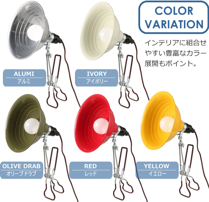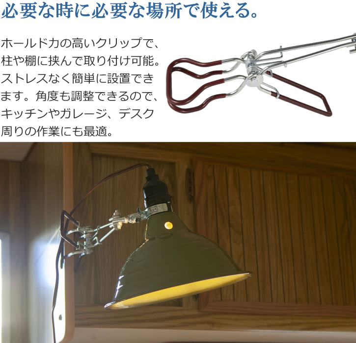 無骨で無機質なデザインながら、どこか懐かしさを感じさせるヴィンテージな雰囲気のディテール。柱や棚に挟んで取り付けることで、個性と明かりをもたらすクリップ式ランプです。クリップのホールド力が強く、角度も調整可能。使用時にソケット根元のスイッチをON/OFFに切り替えるだけなので、キッチンやガレージ、デスク周りの作業にも最適。必要な時に必要な場所で使える便利でおしゃれなアイテムです。(電球は付属しません。)