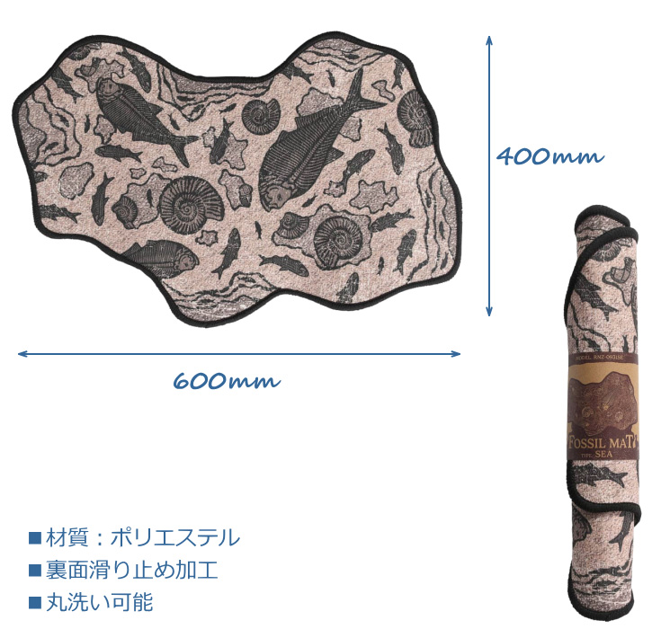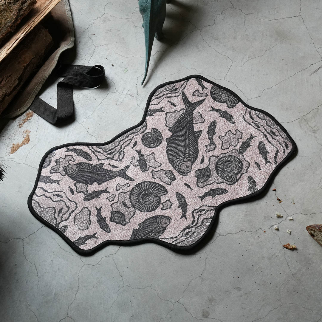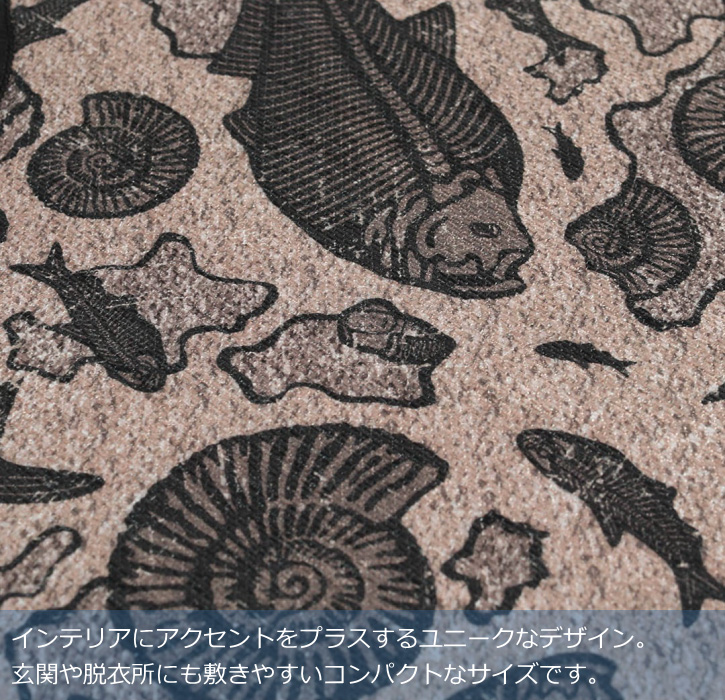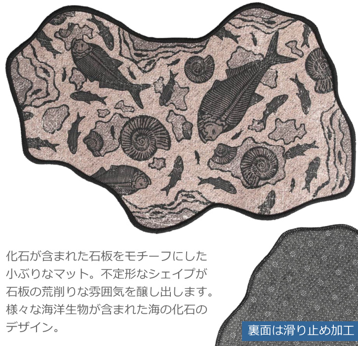 化石が含まれた石板をモチーフにした小ぶりなマット。不定形なシェイプが石板の荒削りな雰囲気を醸し出します。裏面には滑り止めが付いており、丸洗いも可能。玄関や脱衣所に敷きやすいサイズです。こちらは、さまざまな海洋生物が含まれた海の化石のデザイン。