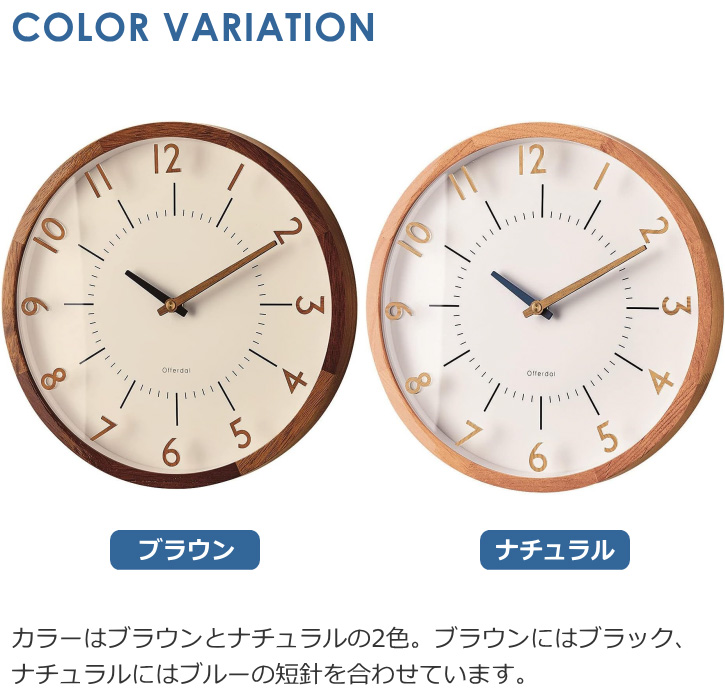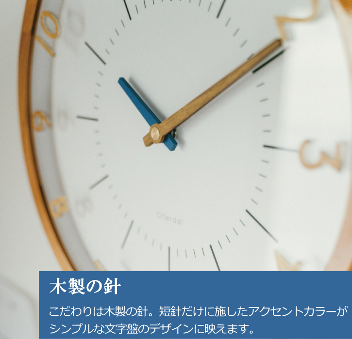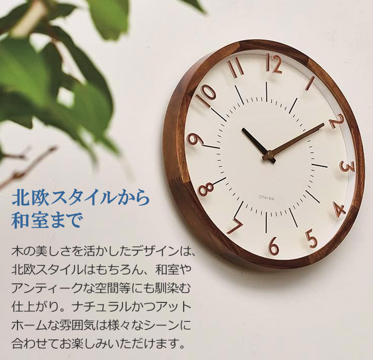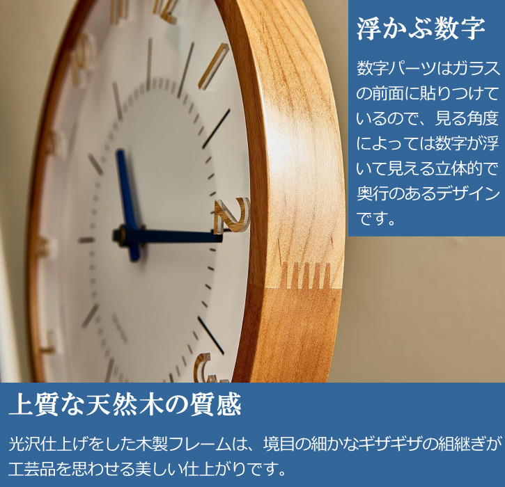 立体的なアクリルの数字と木製の針でナチュラル&シンプルに仕上げた電波時計。前面ガラスの上に数字パーツを置いた立体感と奥行きのある個性的なデザイン。ナチュラルな雰囲気を損なわないように、アクリル製の数字にも木目調のプリントを施しています。北欧風やモダンスタイルだけでなく、和室やアンティークな空間にもよく馴染むルックスです。カラーはブラウンとナチュラルの2色。ブラウンにはブラック、ナチュラルにはブルーの短針がアクセント。時刻合わせを自動で行ってくれる人気の電波時計仕様です。
