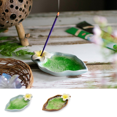 南国のリゾートを感じさせるハワイアンなプルメリアが付いた葉っぱの形の陶器のお香立てです。